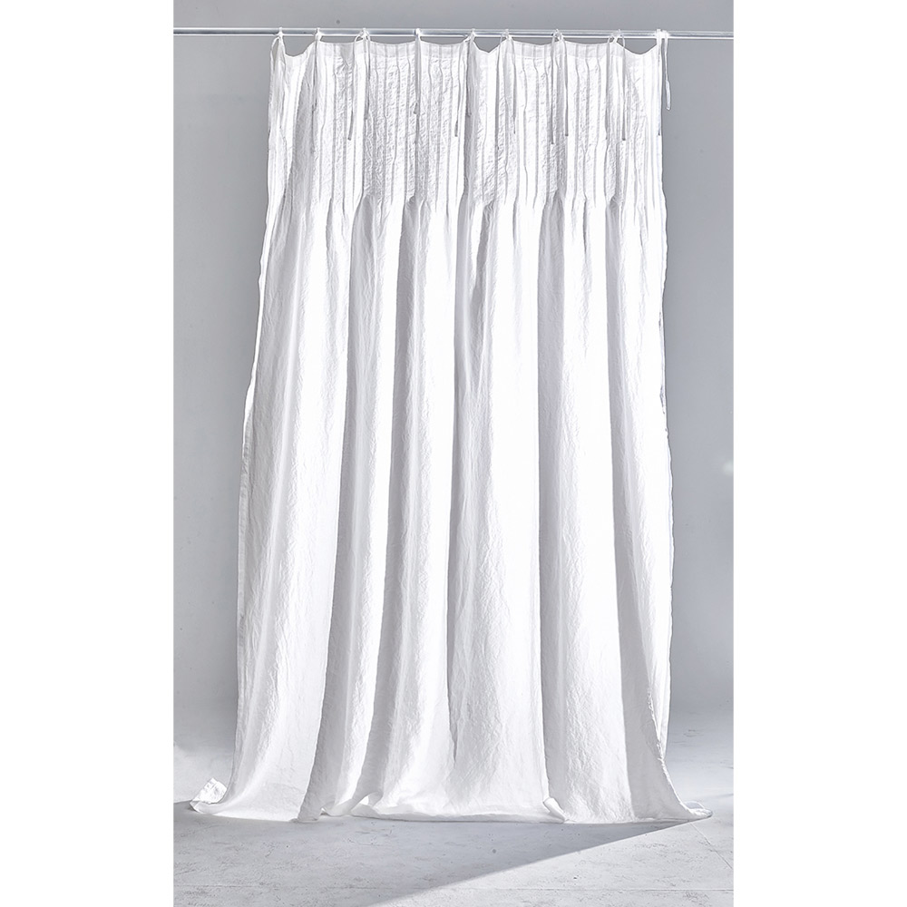 El valor de la tradición se combina con el estilo de vida moderno en esta cortina de lino de luz blanca con con costillas en la parte superior y lazada con cordones.