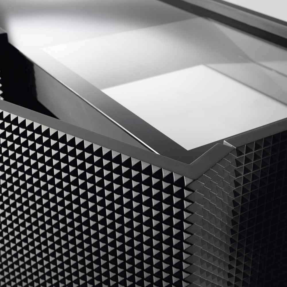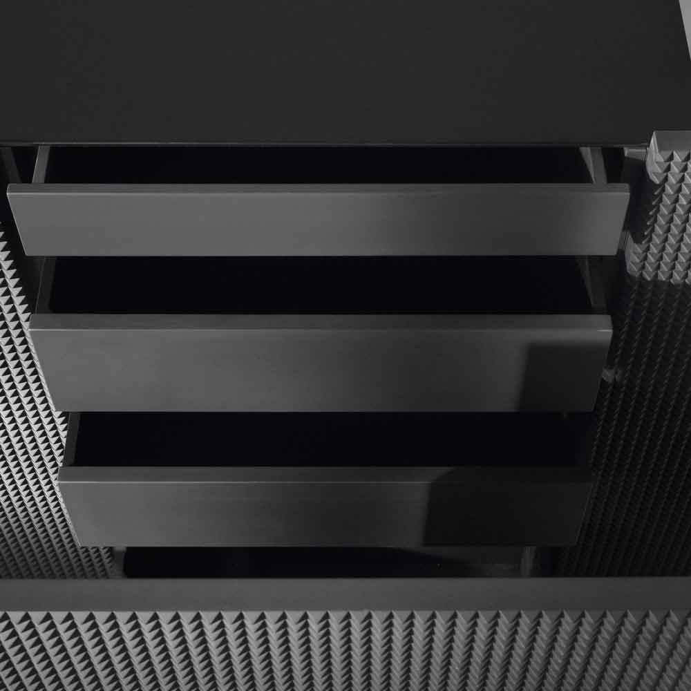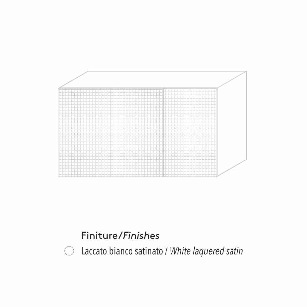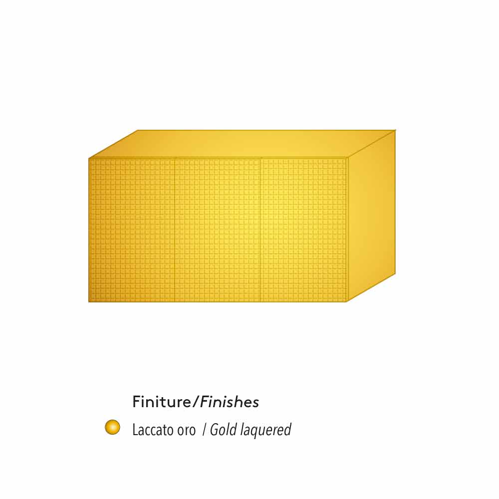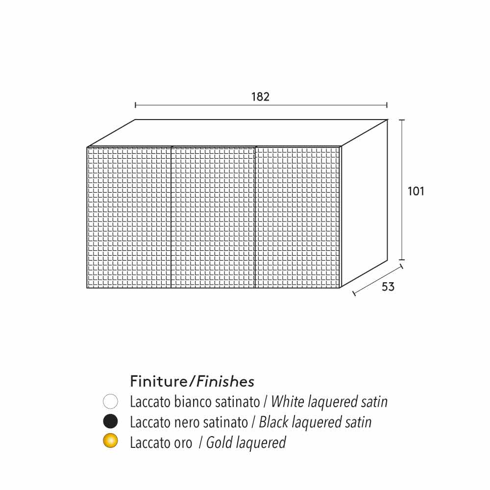 Aparador con 2 puertas que se abren en los lados y un cajón extraíble central dotado de tapa en vidrio pintado. En el interior hay 2 estantes de vidrio. acabados disponibles: la laca satinada blanca, satén negro lacado o el oro.