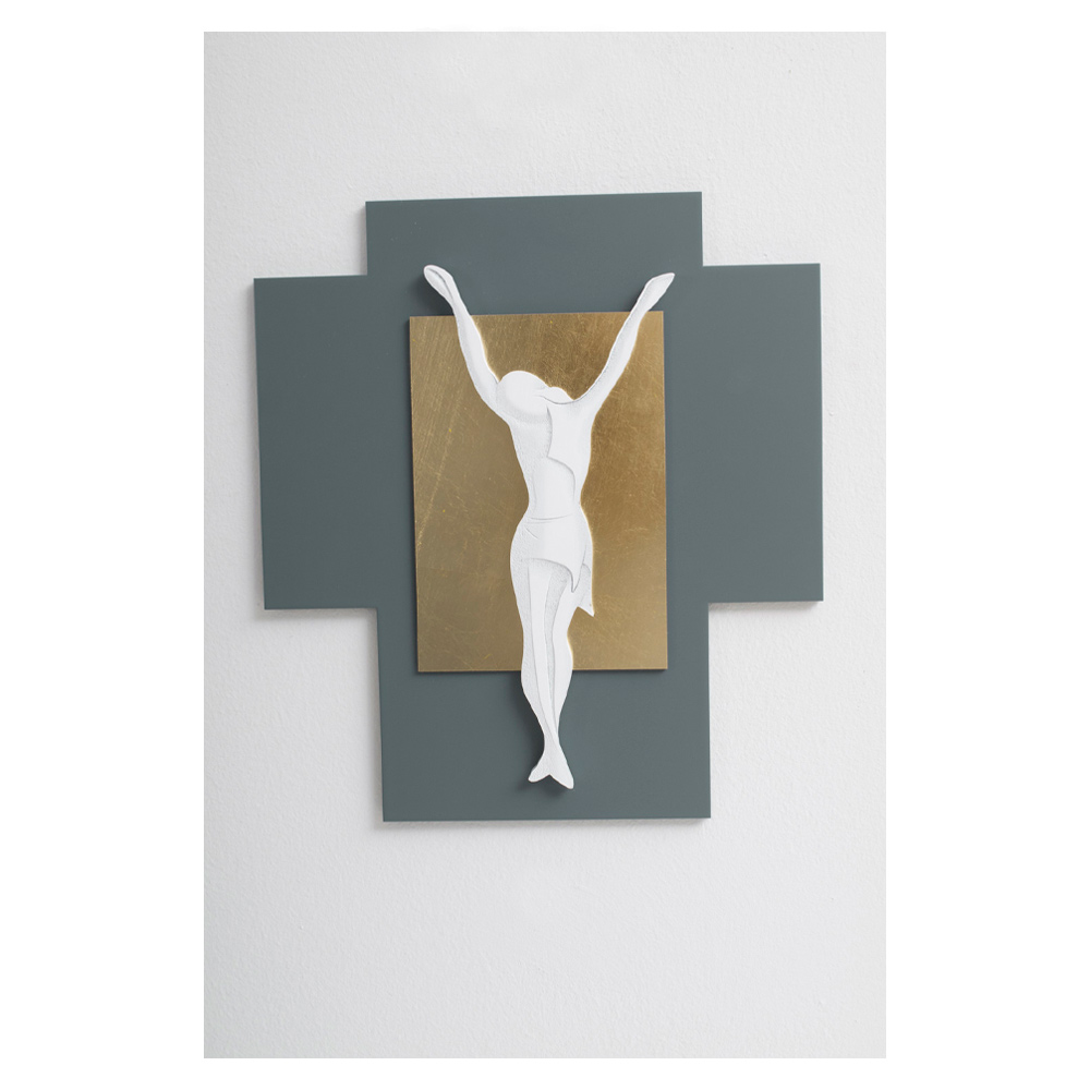 Crucifijo de madera lacada en azul con aplicación de escuadra en pan de oro precioso y Jesús de madera lacada en blanco con ligeros grabados a láser.