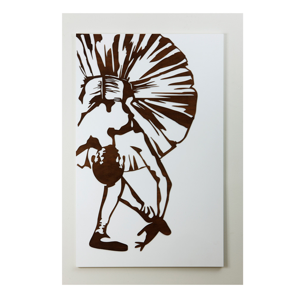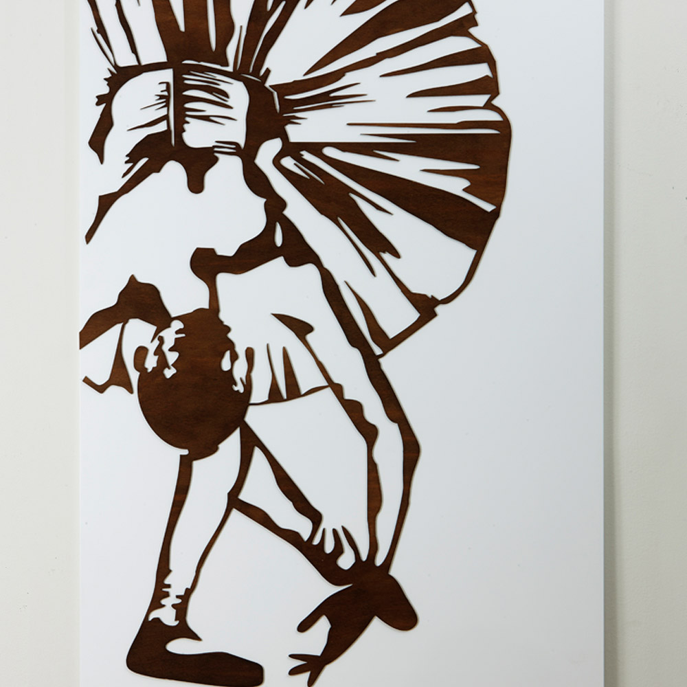 El panel decorativo está realizado mediante la técnica de marcado láser que crea un bajorrelieve en el material, creando diferentes gradaciones de color creadas en el panel. El armazón es de madera lacada en blanco con aplicaciones en color wengué .