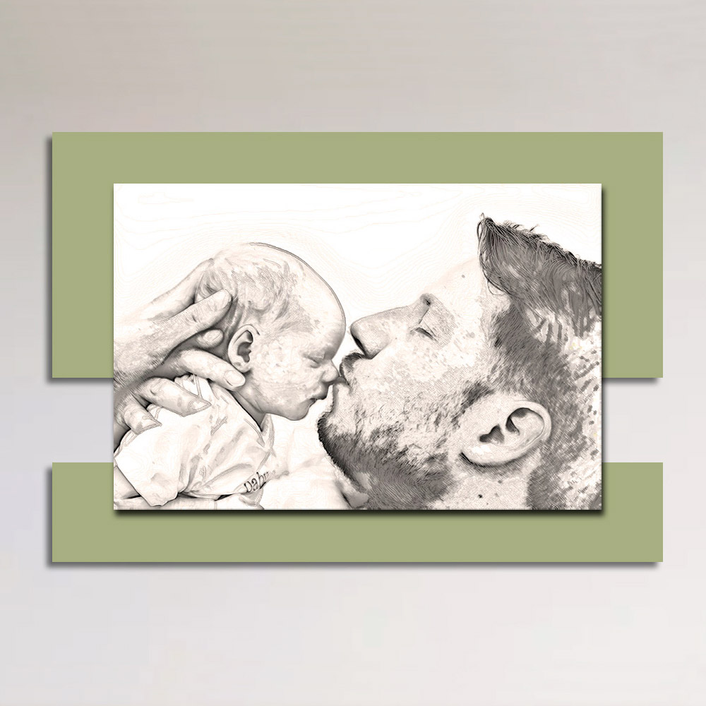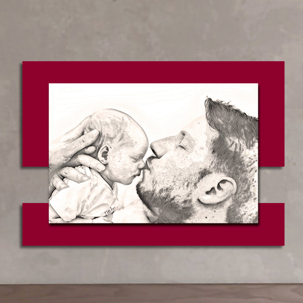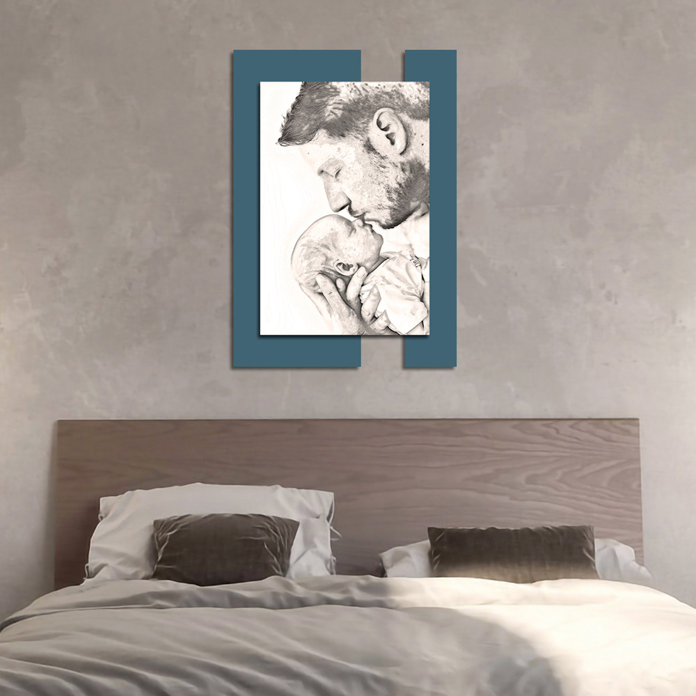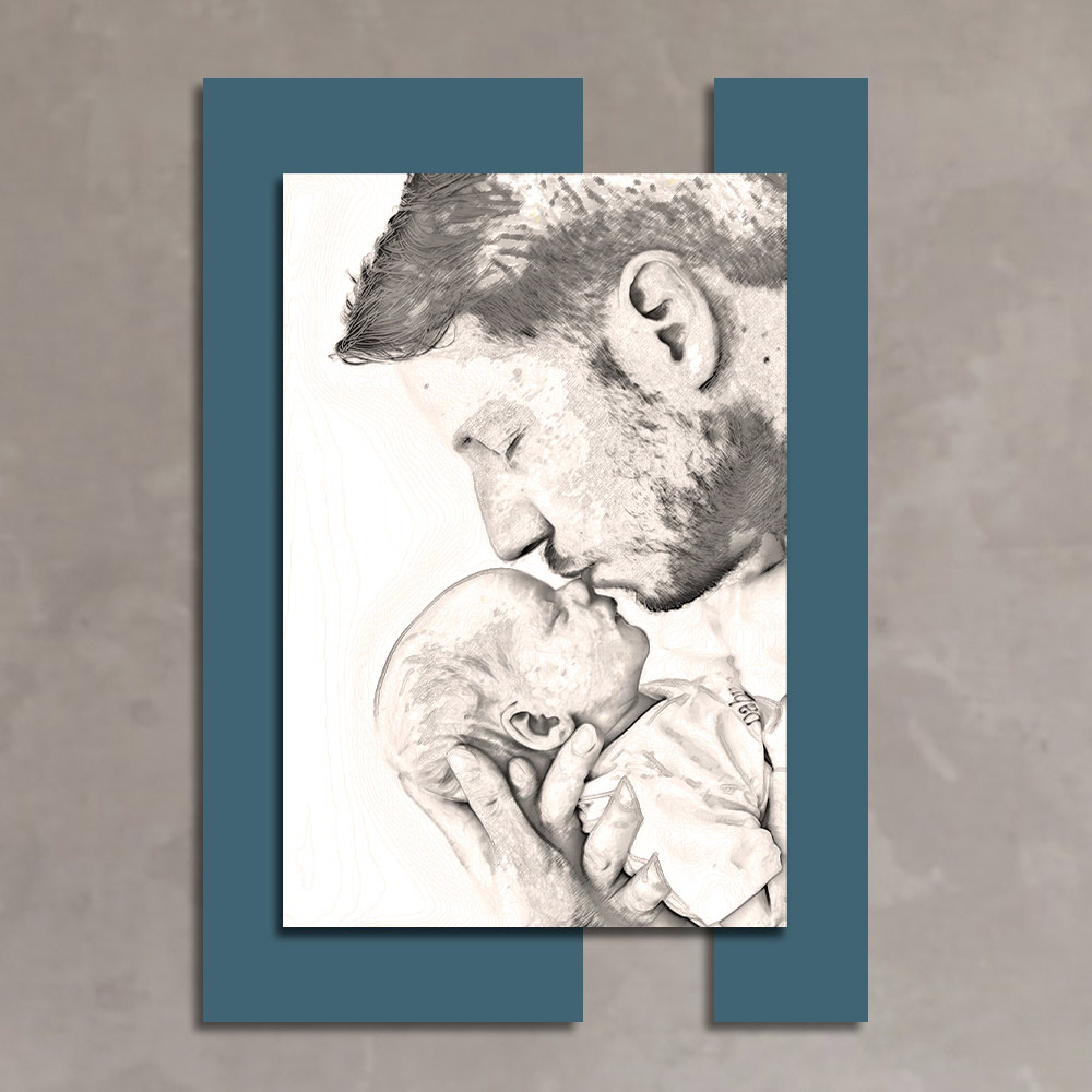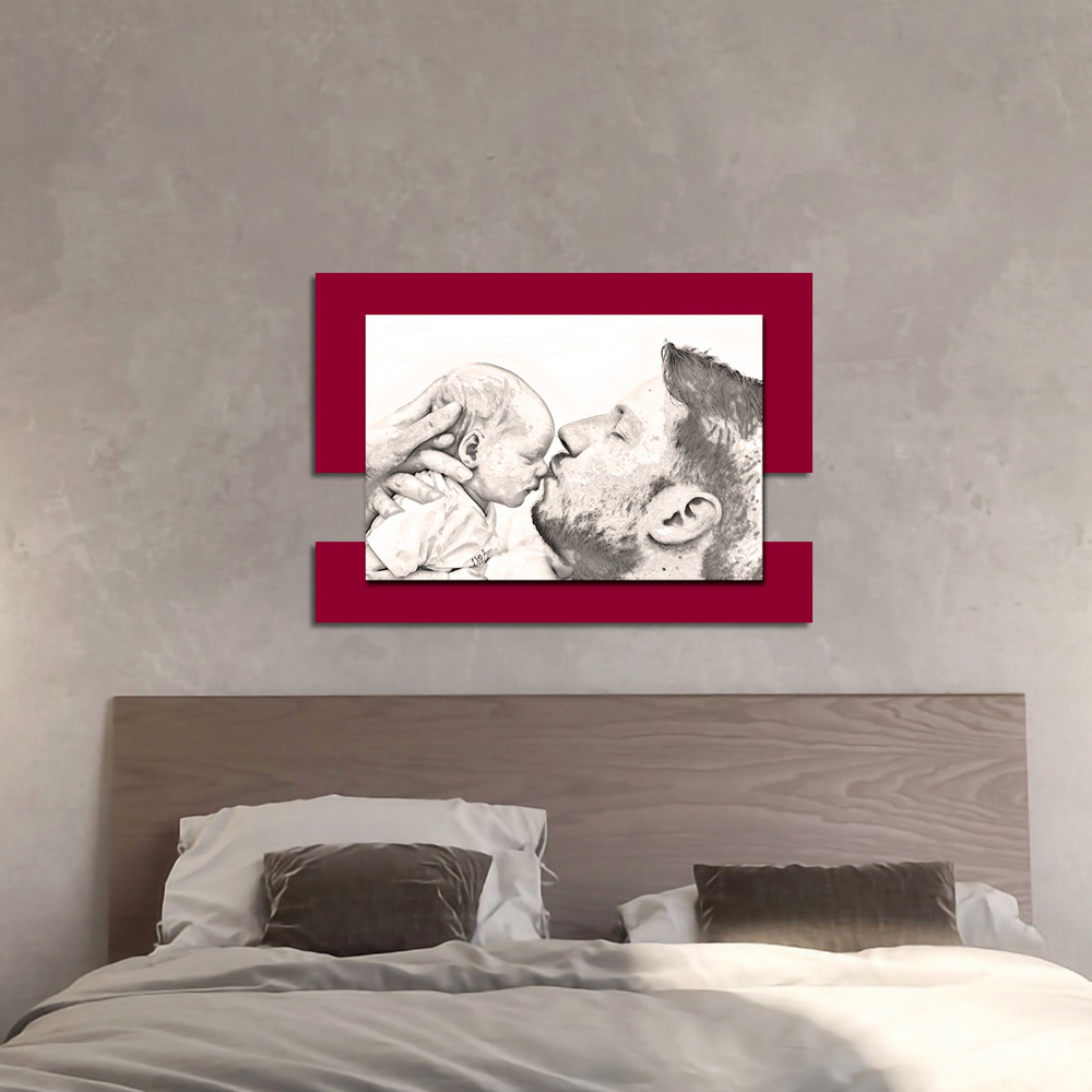 madera con estampado de un hombre besando a un niño. Casquillos para colgar