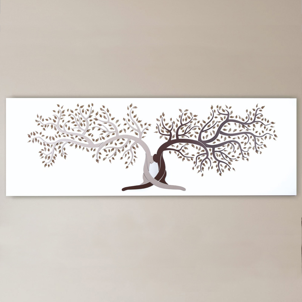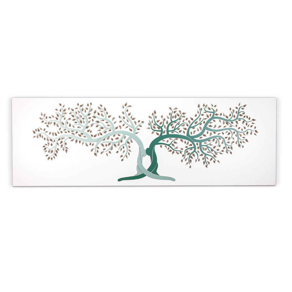 Panel decorativo que representa la unión de dos troncos con un abrazo, símbolo de vida. Ramas y hojas hechas con marcado láser se ramifican desde el tronco. Panel de madera lacado en blanco mate con aplicaciones en madera lacada en dos tonos grava y cacao o en su variante verde y marcado láser.