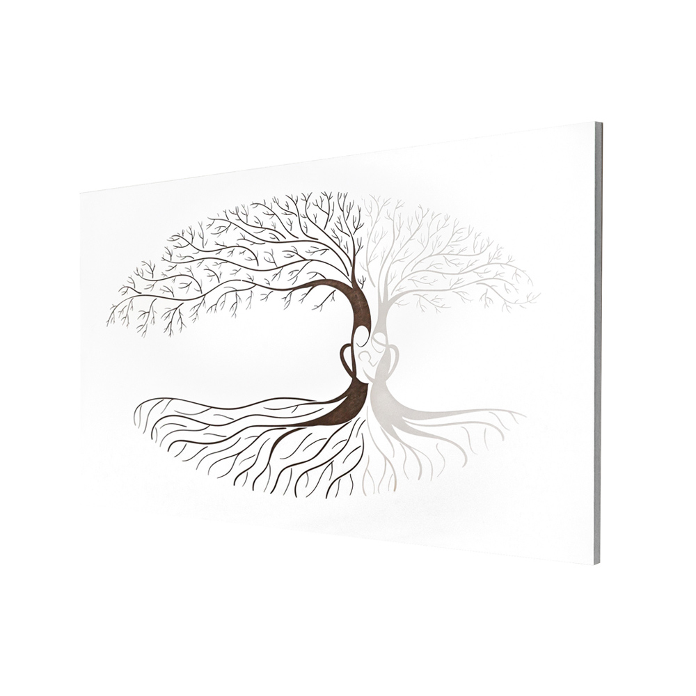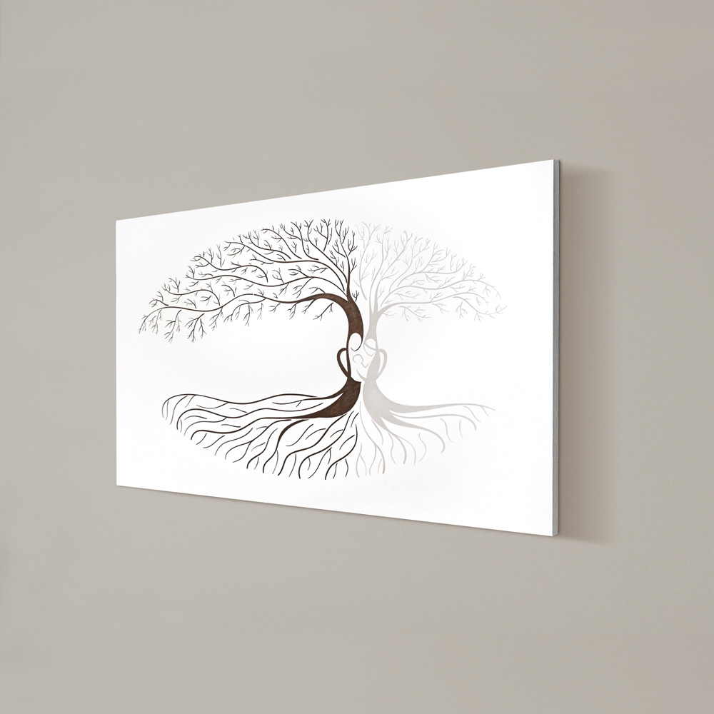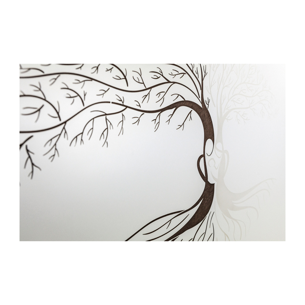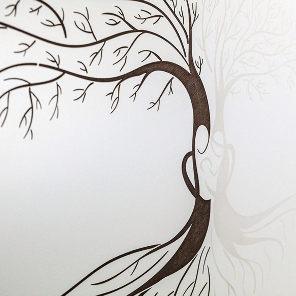 Panel de decoración que representa la unión de dos troncos en un abrazo familiar, símbolo de vida.