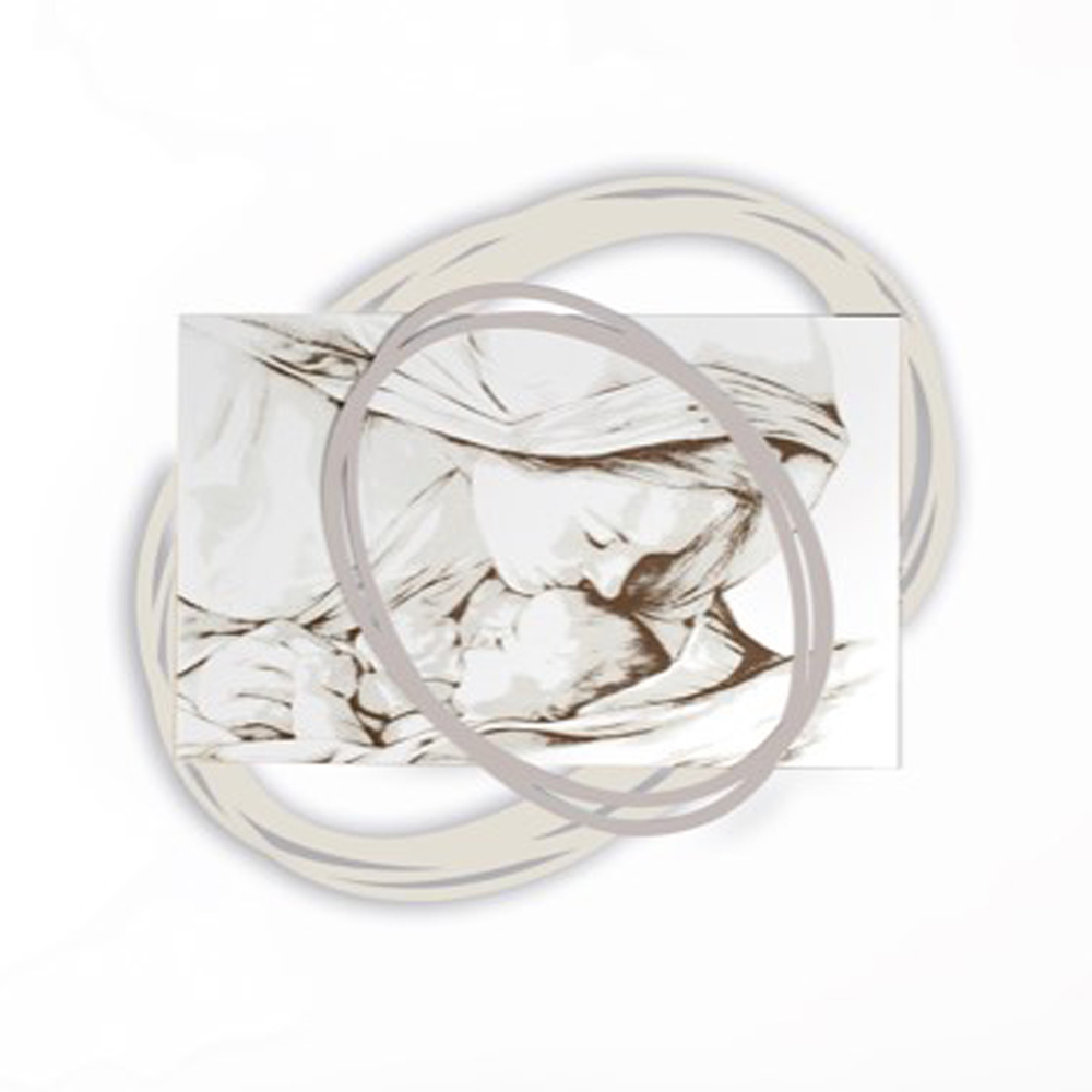 Un cabecero que representa un beso de la Virgen a su hijo gracias al marcado láser, que muestra los rasgos de los rostros. Panel de madera lacado en blanco mate con marcado láser, una técnica especial que crea un bajorrelieve sobre los materiales.