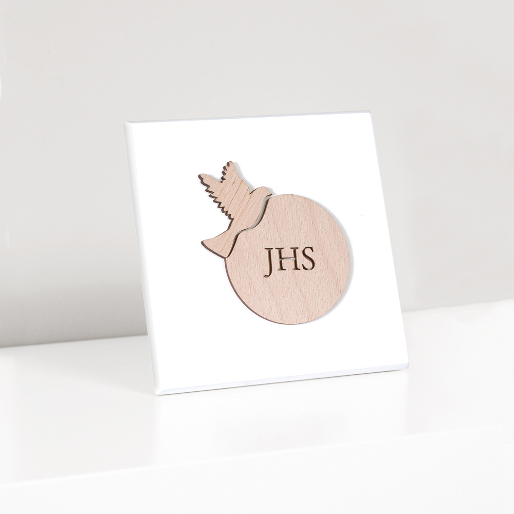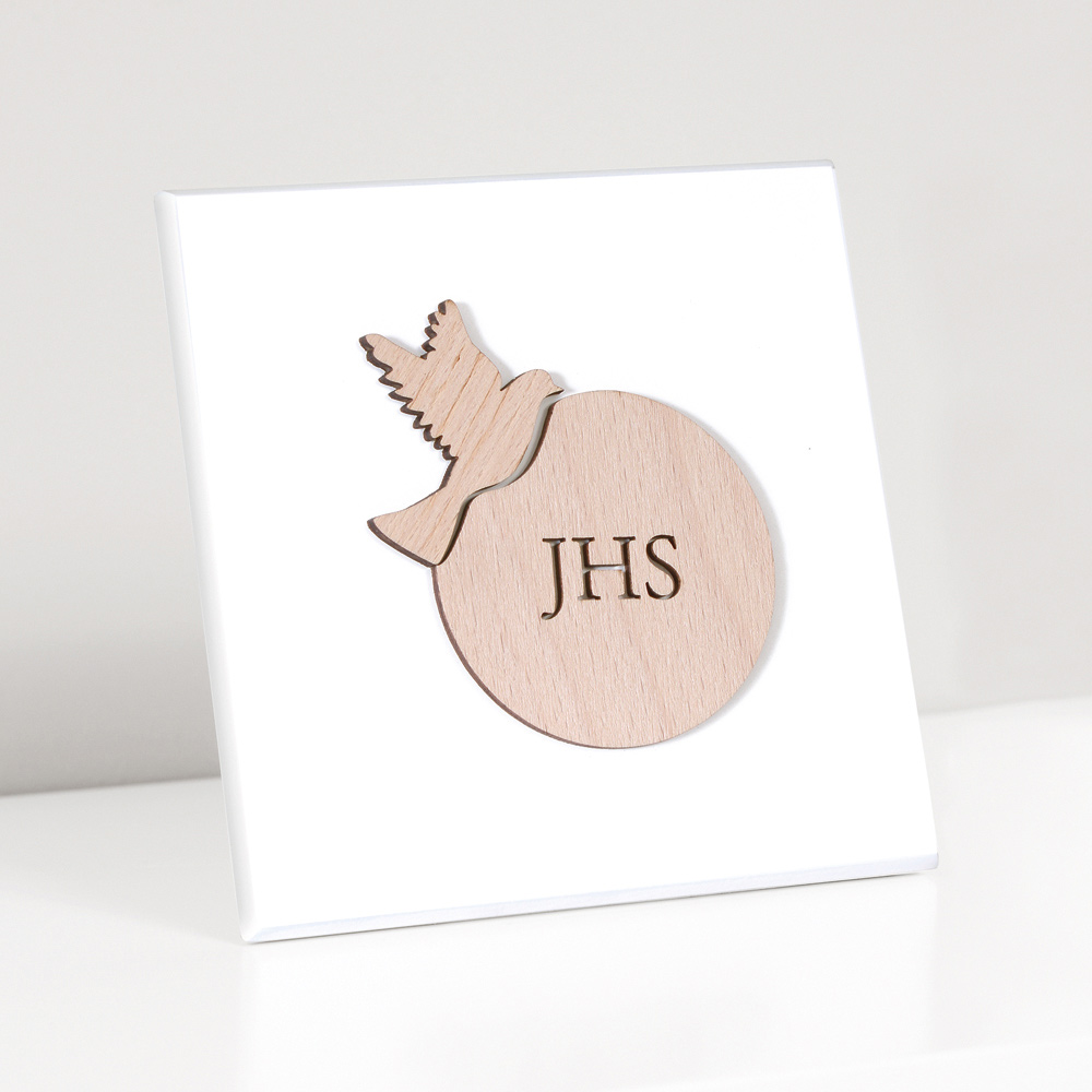 Cuadro sagrado con hostia y paloma de confirmación en madera natural aplicada. Panel de madera lacado en blanco con pie de apoyo y orificio para colgarlo en la pared.