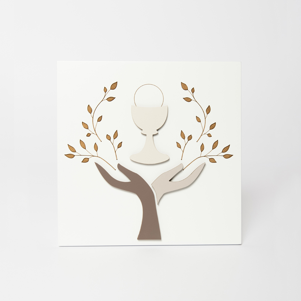 Cuadro sacro con decoraciones aplicadas en madera lacada cacao, grava y arena y marcado láser de ramas y hojas. Representa dos manos que acogen el cáliz de la comunión. El cuadro es de madera lacada en blanco con un hueco para colgarlo en la pared y un pie de apoyo.