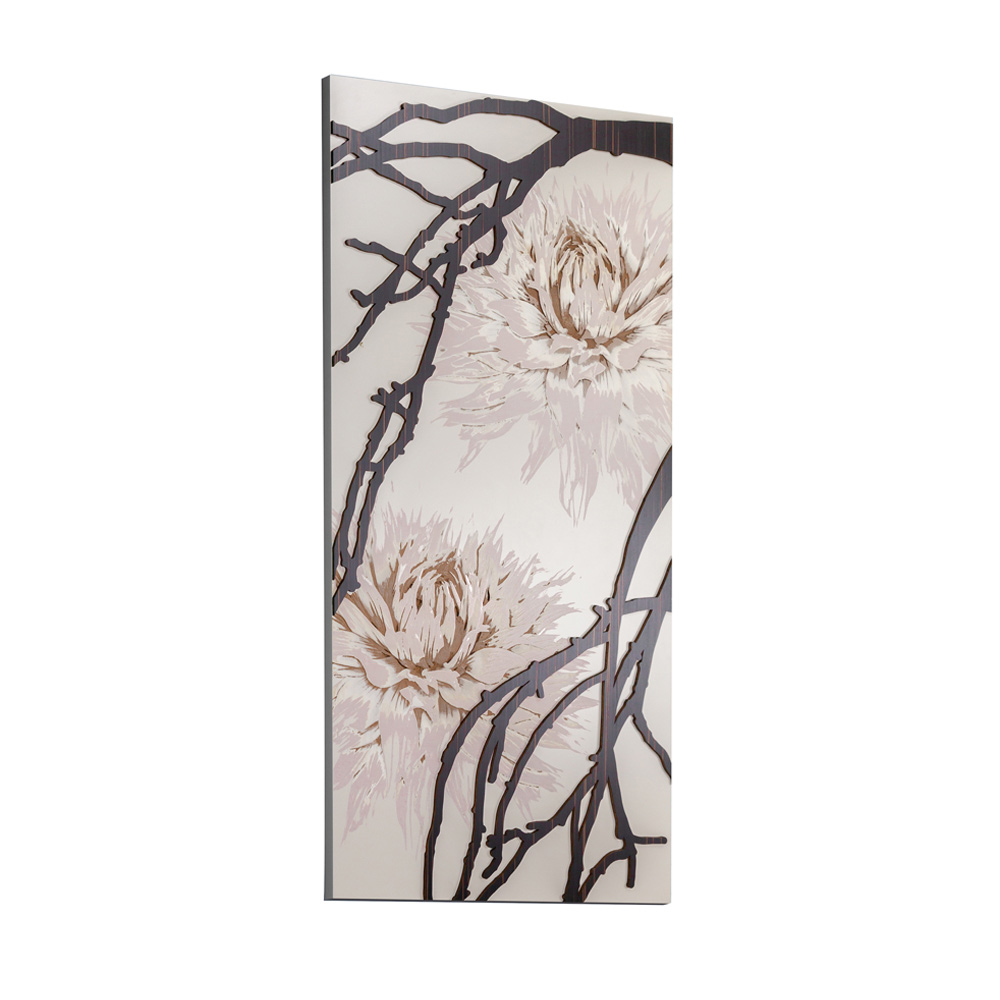 El panel decorativo está realizado mediante la técnica de marcado láser que crea un bajorrelieve en el material, creando diferentes gradaciones de color de la flor, precisamente la Dalia. El cuadro está realizado en madera lacada arena mate con aplicaciones en madera de ébano . El color rosa de las dalias viene dado por la técnica de marcado láser.