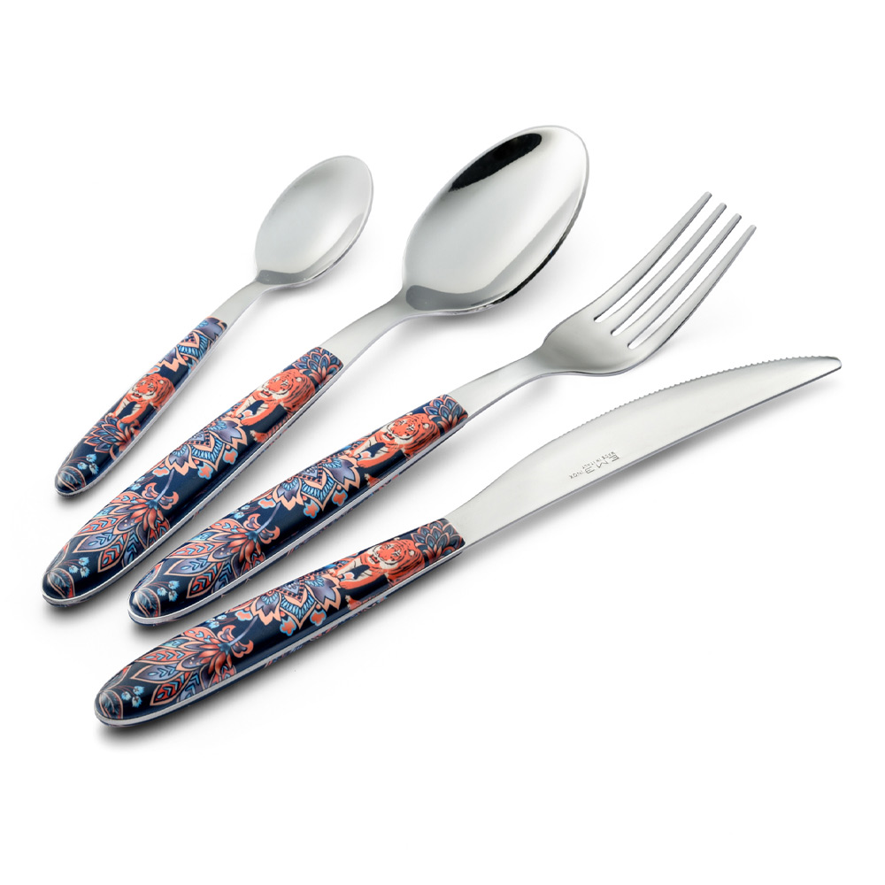 Cubertería de acero inoxidable y mango de plástico de colores con tigre, 24 piezas made in Italy.