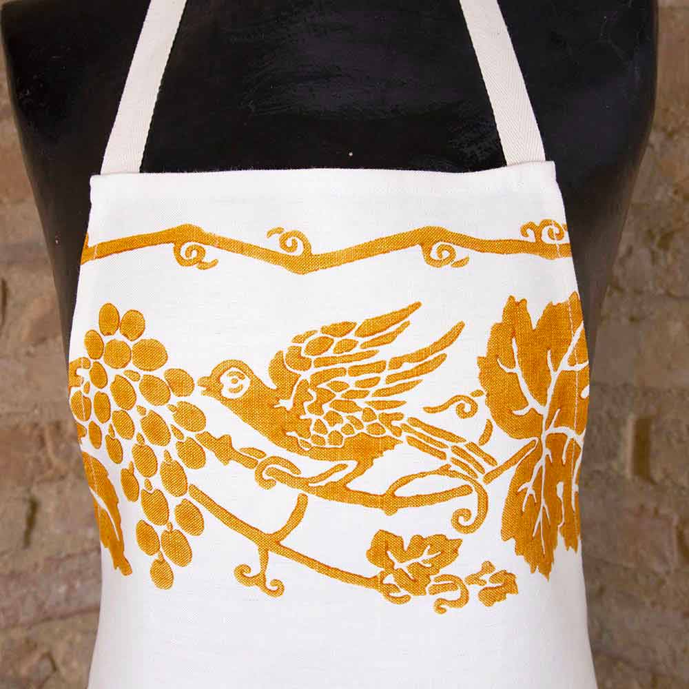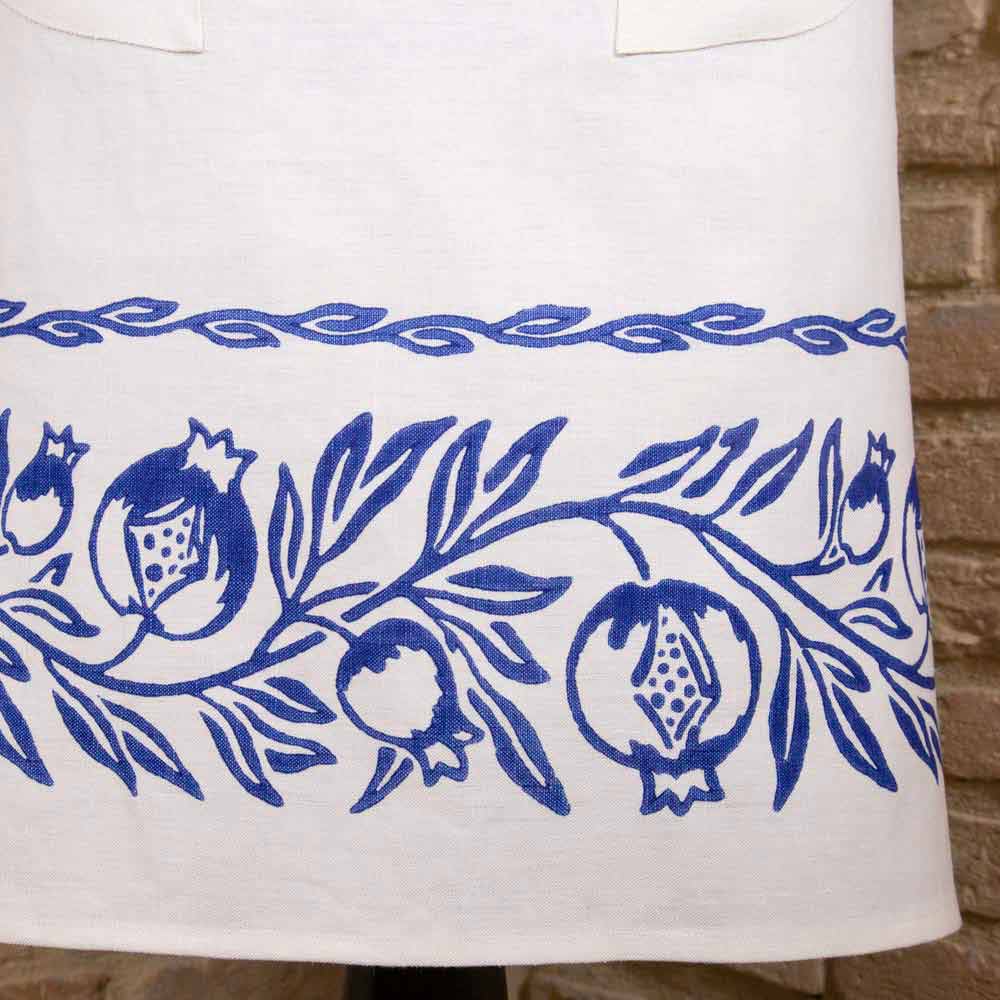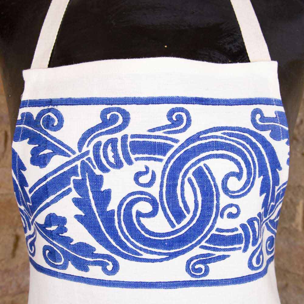 Delantal de cocina con babero y bolsillos de alta artesanía en lino puro con antiguo diseño de arte impreso a mano, disponible en tres variantes, pieza única de calidad italiana.
