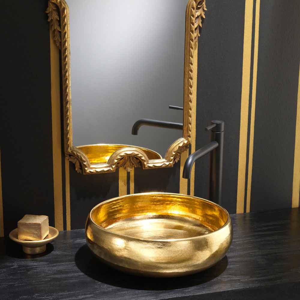 Fregadero de la encimera del baño hecho a mano y convertido en Italia en cerámica raku con acabado de oro de 24k.