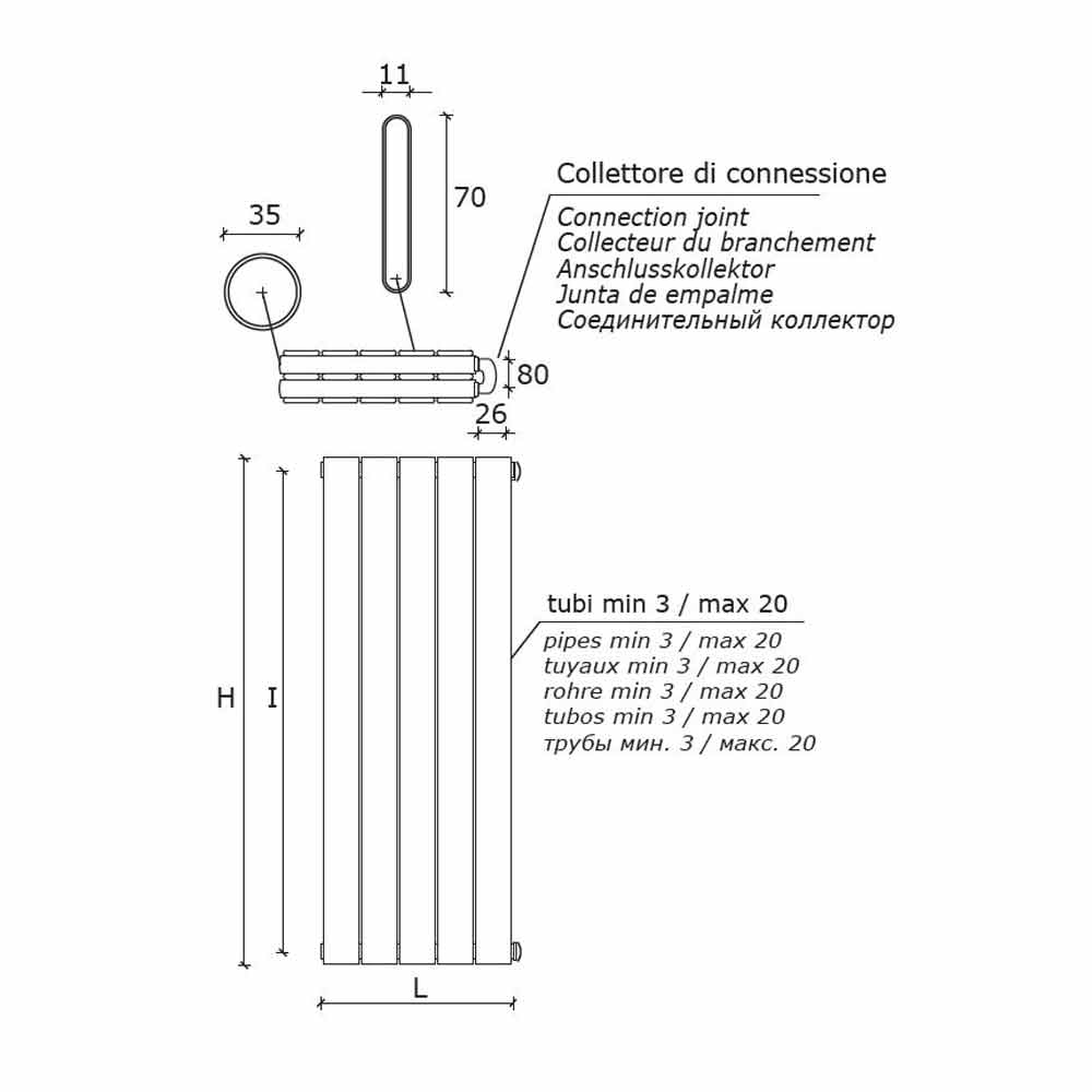 Este radiador presenta un diseño que consta de tubos planos verticales de 70x11 mm y colectores de 35 mm de diámetro.