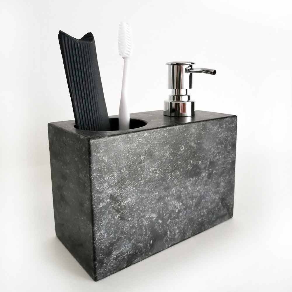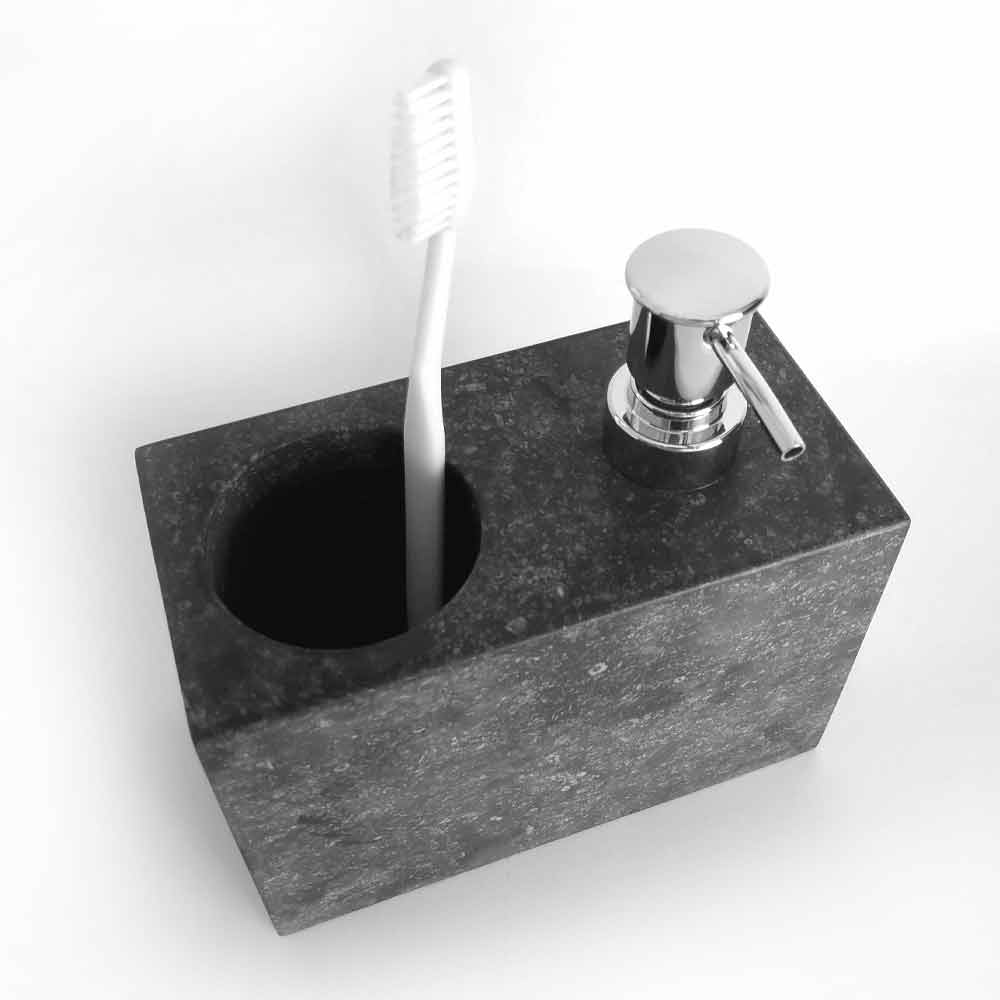 Dispensadores de jabón líquido con orificio para cepillos de dientes y pasta dentífrica fabricados artesanalmente en mármol negro con veteado en tonos grises en acabado pulido obtenido mediante procesos artesanos específicos que tratan el producto en detalle y aportan aún más calidad. Su diseño geométrico y líneas simples hacen del producto la opción ideal para completar el mobiliario de baños con un gusto minimalista y moderno, combinando el aspecto decorativo con el funcional.