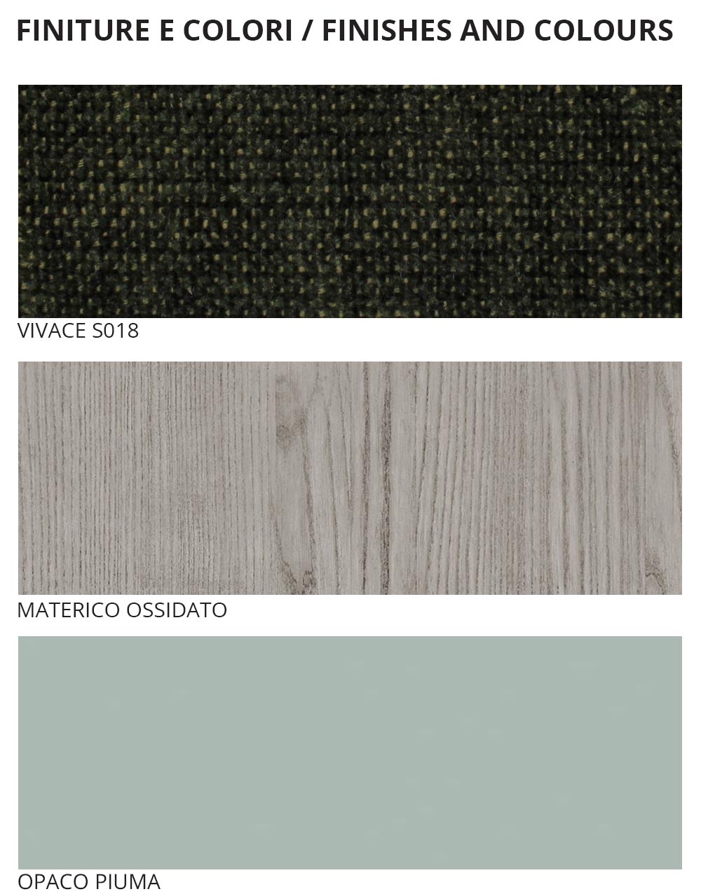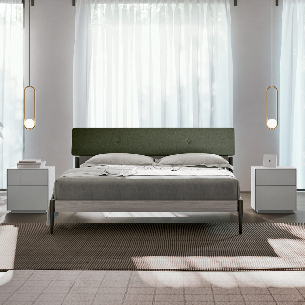 Dormitorio doble con 4 elementos totalmente fabricado en Italia . La composición incluye una cama doble con marco de madera cama en acabado material oxidado, cabecera cubierta de tela y patas de metal pulidas, 2 mesitas de noche con 2 cajones cada uno y un pecho de 4 cajones de cajones de madera lacada mate pluma y material oxidado. Un diseño que reelabora en clave contemporánea una referencia al gusto retro mediante el uso de una combinación de accesorios ligeramente redondeados que dan vida a un confort y una acogida pertenecientes a un estilo pasado. La particular configuración que enriquece los frontales de la cómoda permite que la estancia adquiera aún más autenticidad gracias a un original juego de contrastes con diferentes colores y acabados.