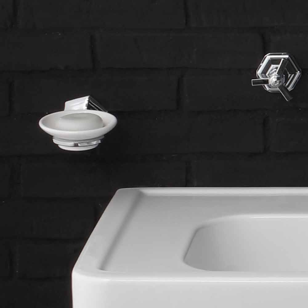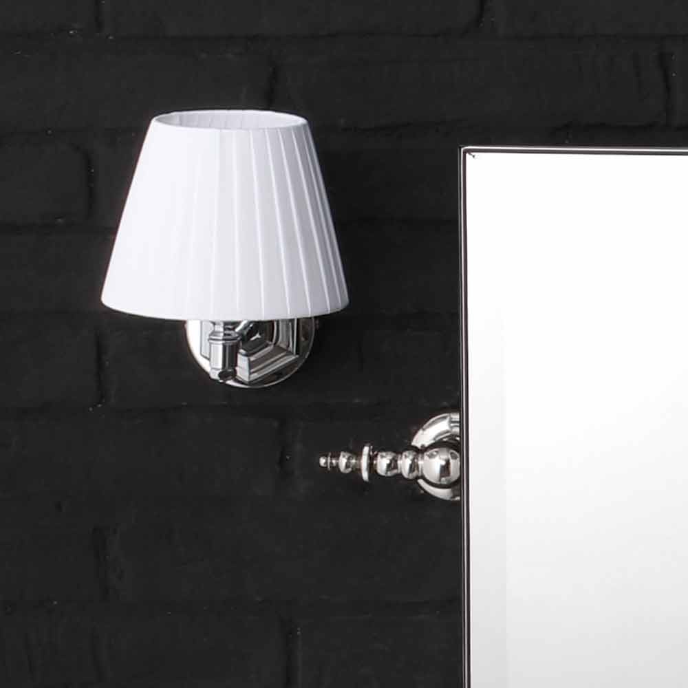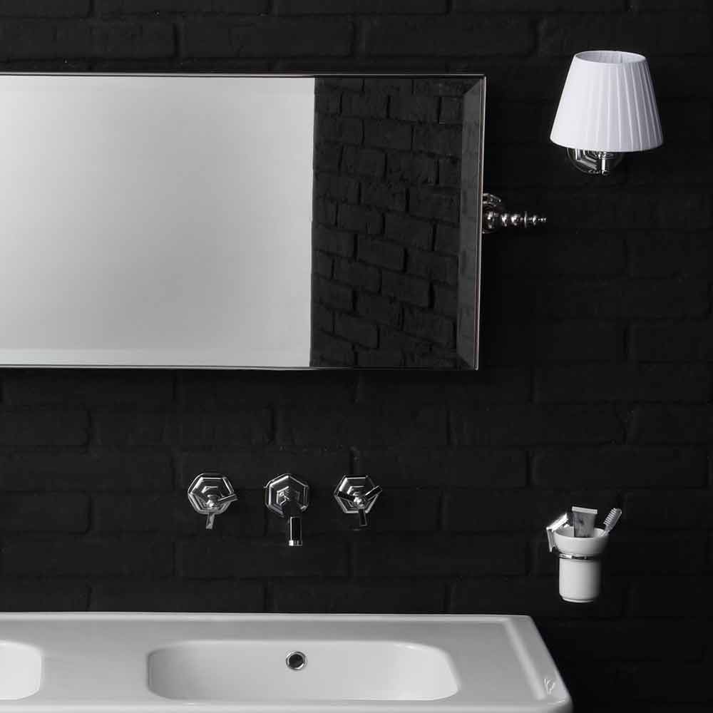 La serenidad se completa y enriquece con la presencia de un hermoso y elegante jabonera de pared de cerámica con detalles cromados y un portacepillos de dientes en el mismo diseño, todo ello completado por dos hermosos apliques de lujo en latón cromado y pantalla de algodón.