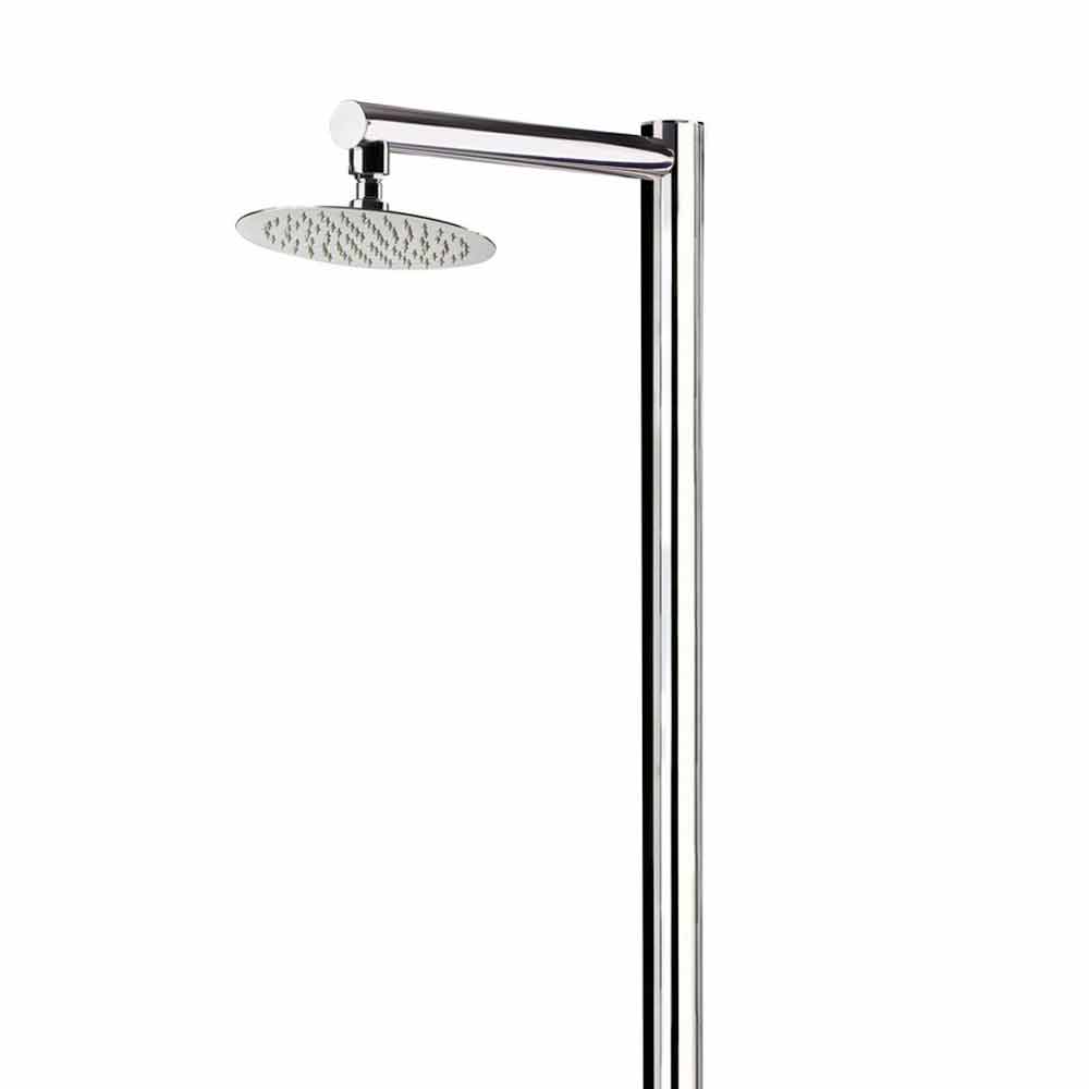 Ducha exterior en acero con lavapiés y grifería temporizada Fabricada en Italia.