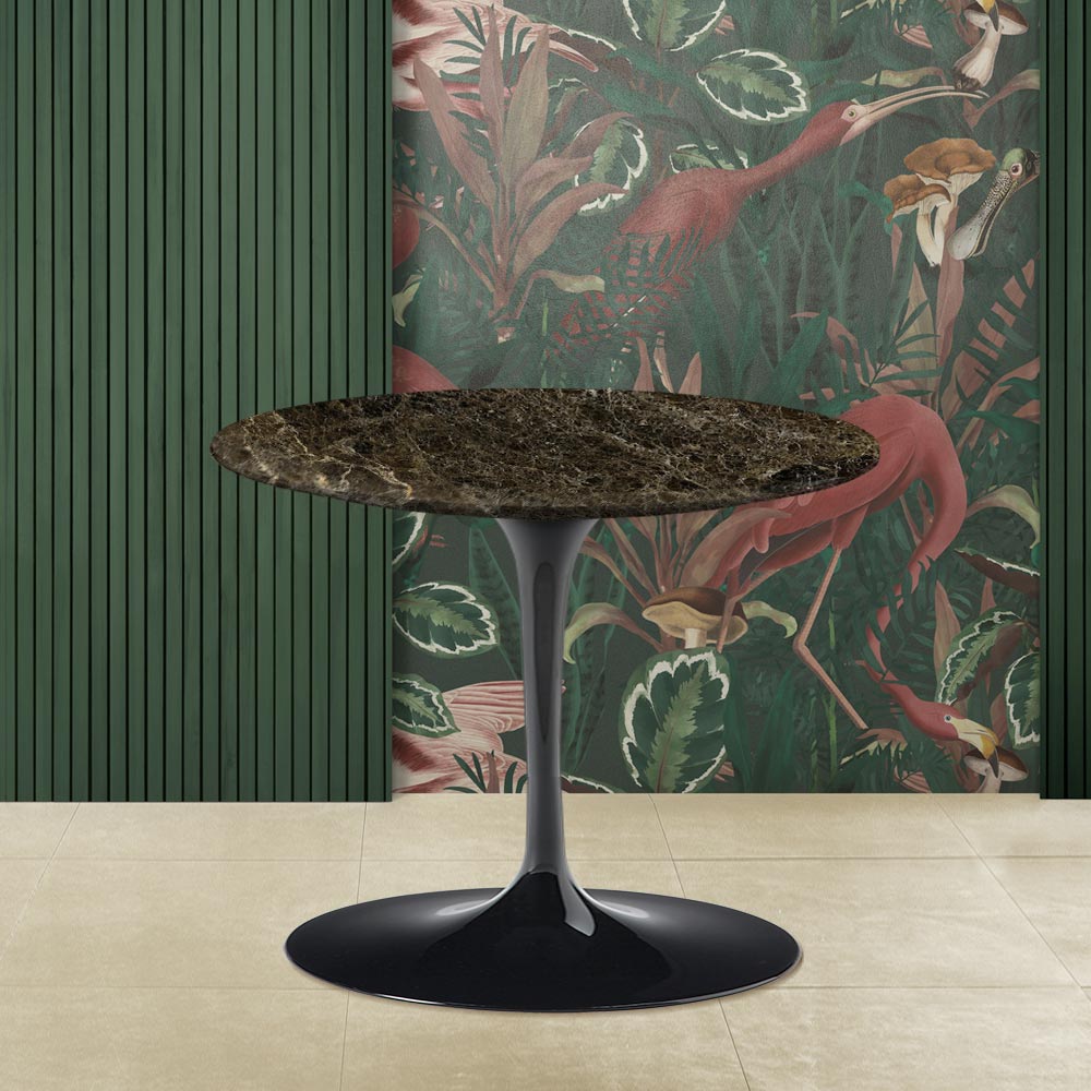 Mesa de centro con tapa redonda en mármol emperador oscuro y base en aluminio pulido fabricada en Italia