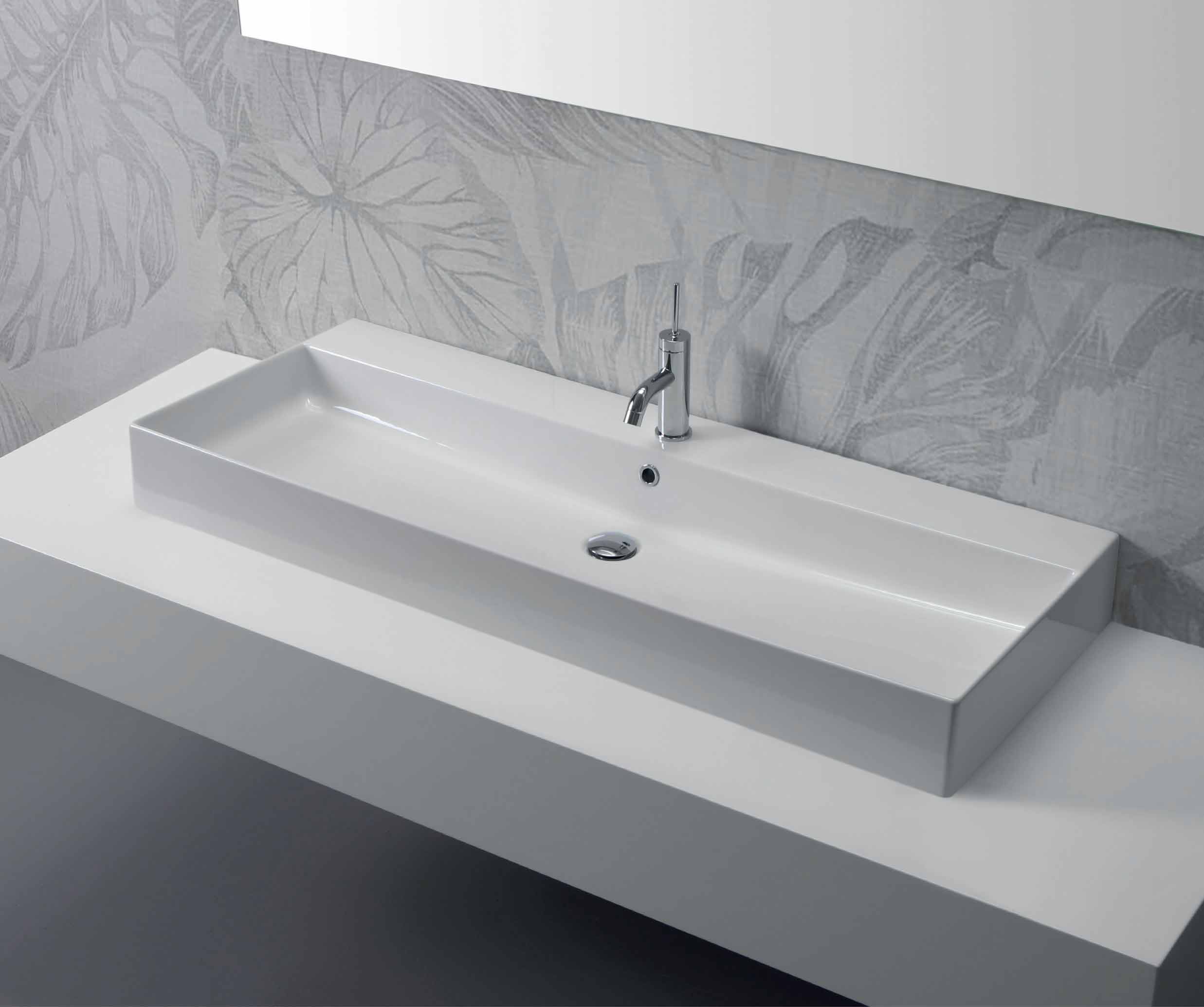 Este fregadero de diseño tiene un orificio central para el grifo y se puede montar en la pared o se puede usar como un fregadero de mostrador . Está disponible en diferentes dimensiones.