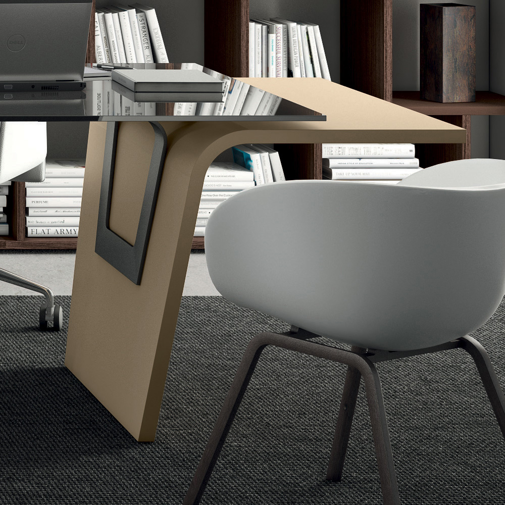 Este escritorio se compone de una tapa de cristal en el acabado castaño, sostenida por un par de patas no alineadas en Mdf lacado en el acabado RAL 1019 Beige Grisáceo, todo ello unido por un par de soportes de hierro pintado en el acabado bruñido.