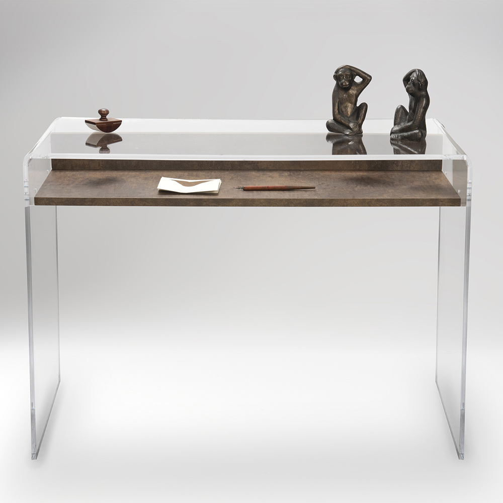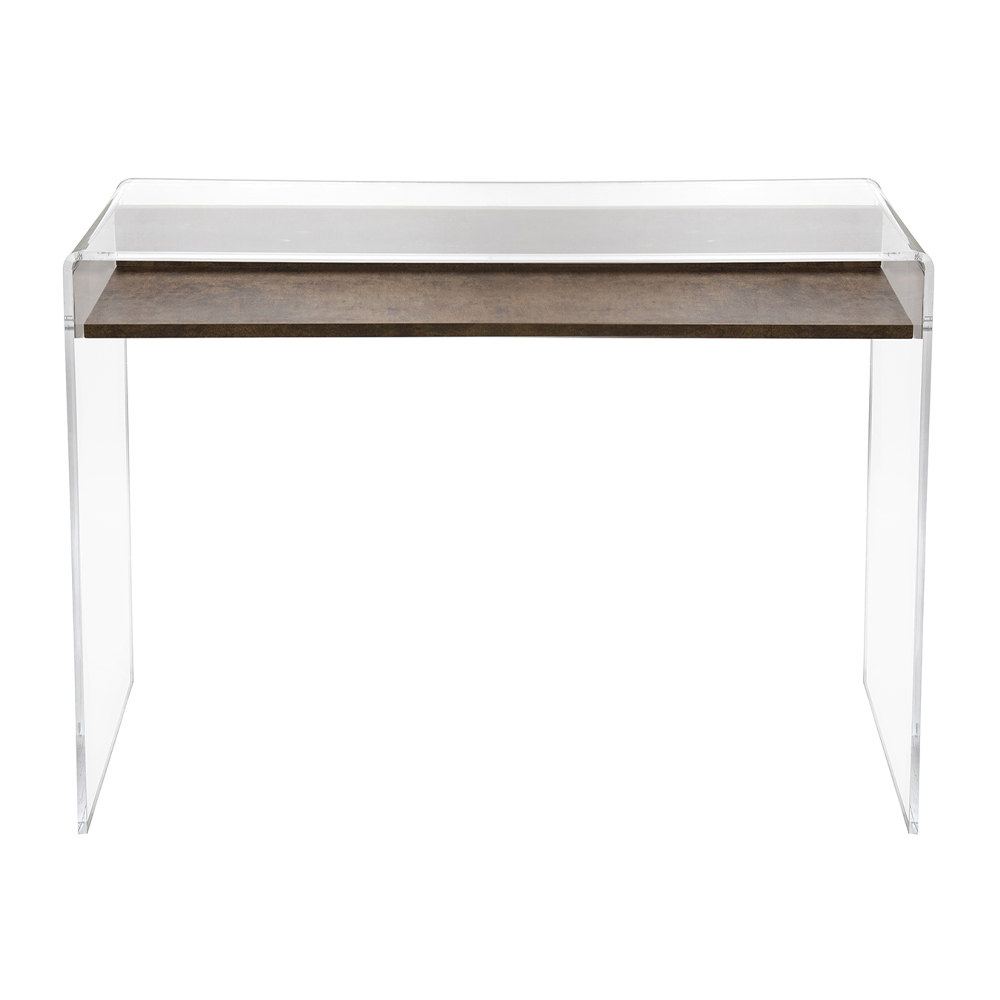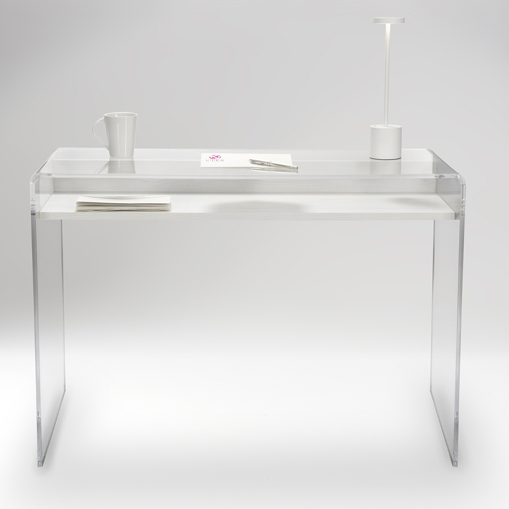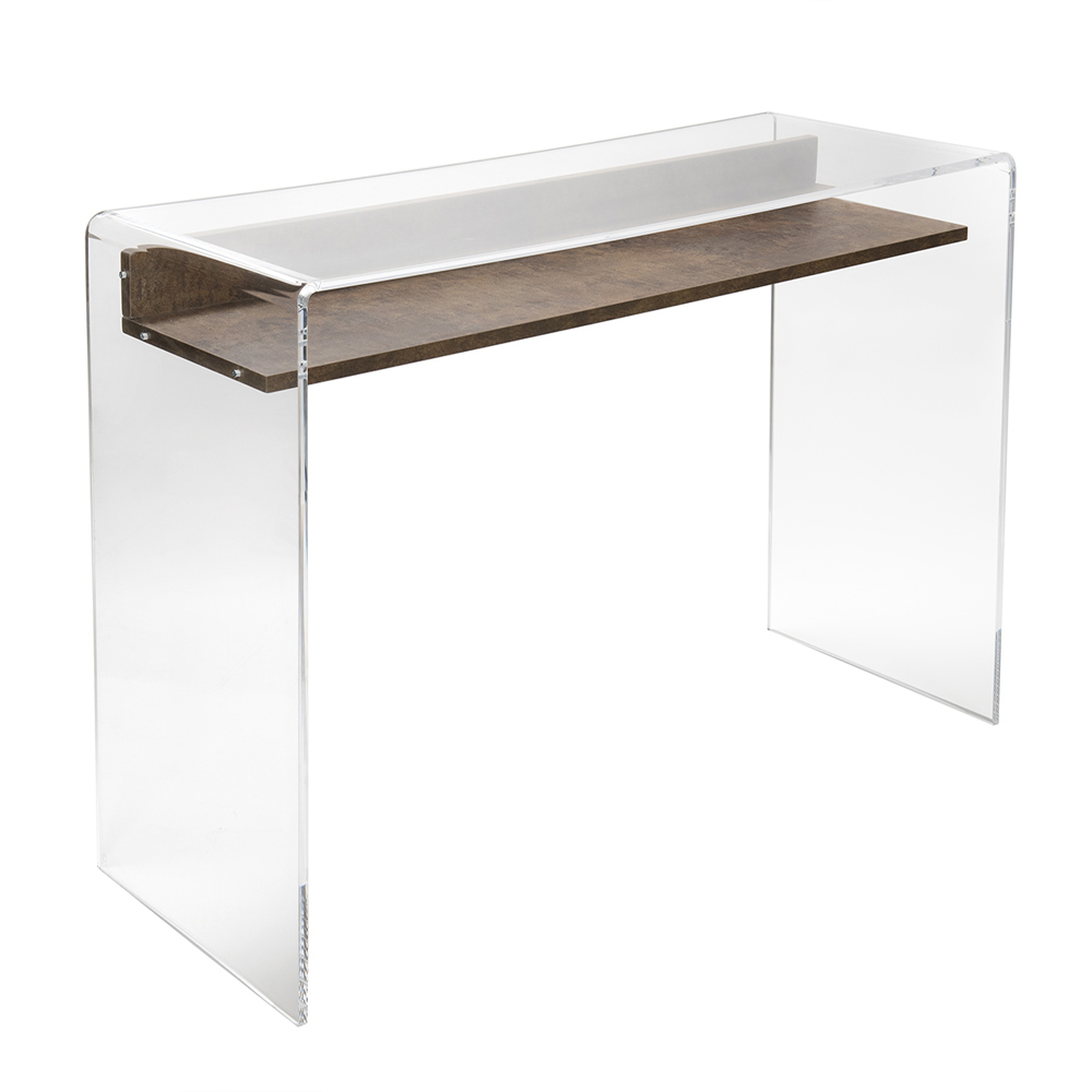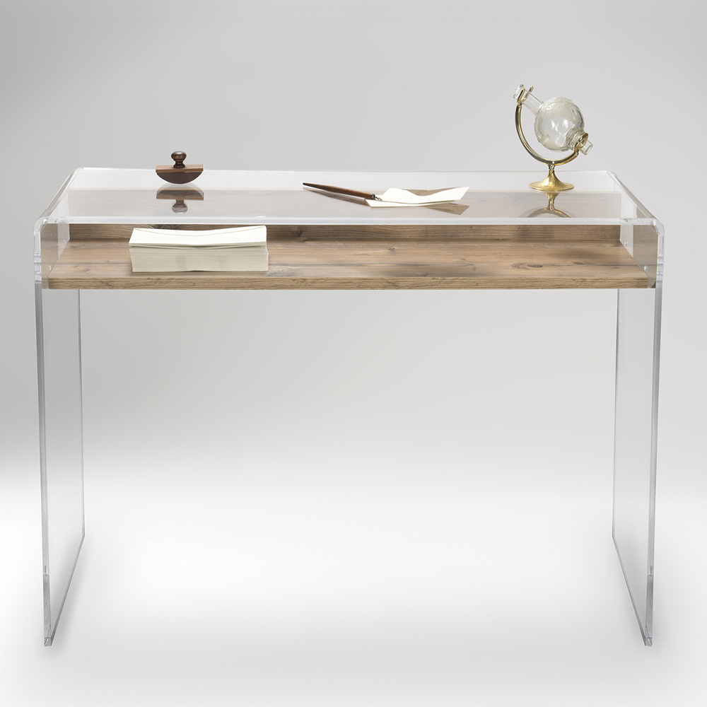 Consola de diseño moderno en plexiglás transparente cortado a láser con estante de madera, diseño made in Italy.
