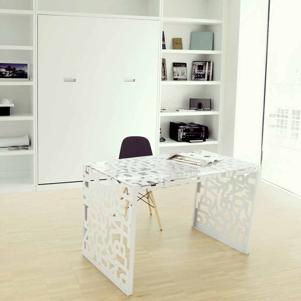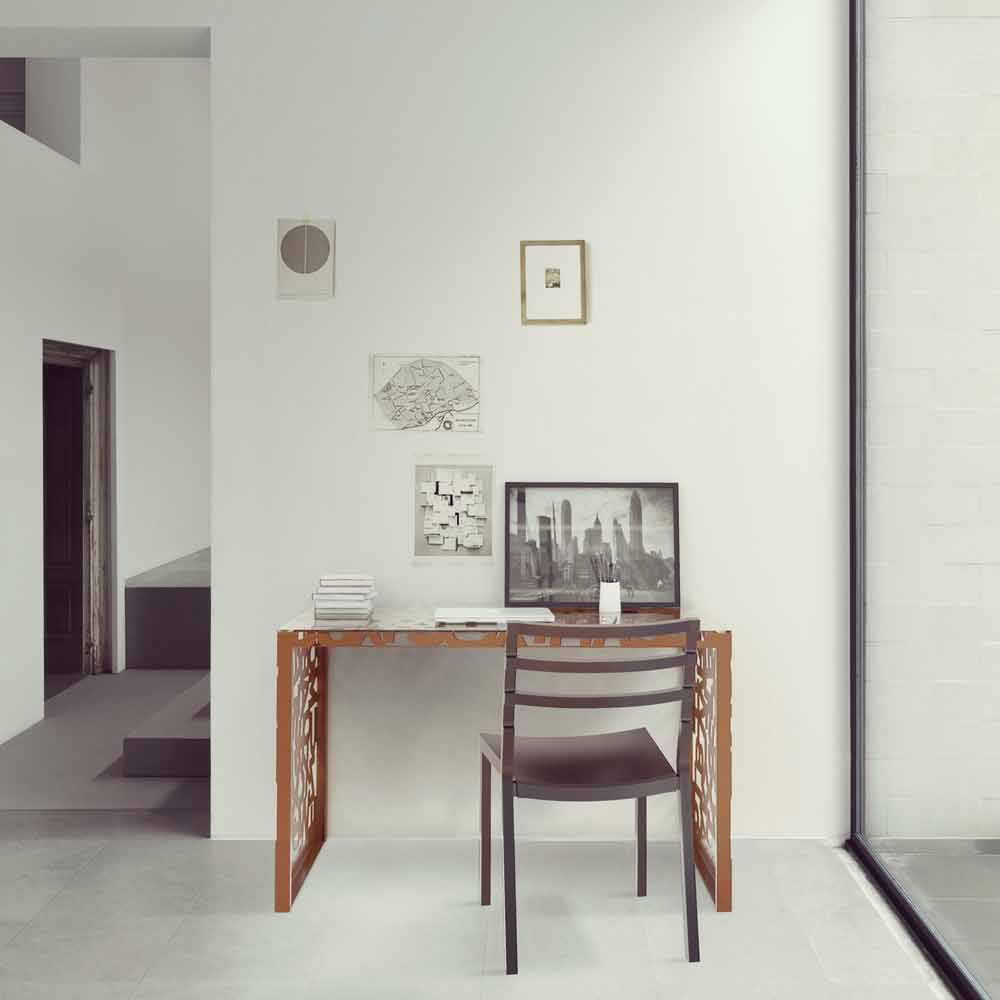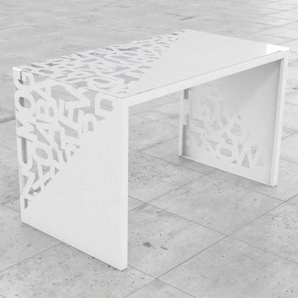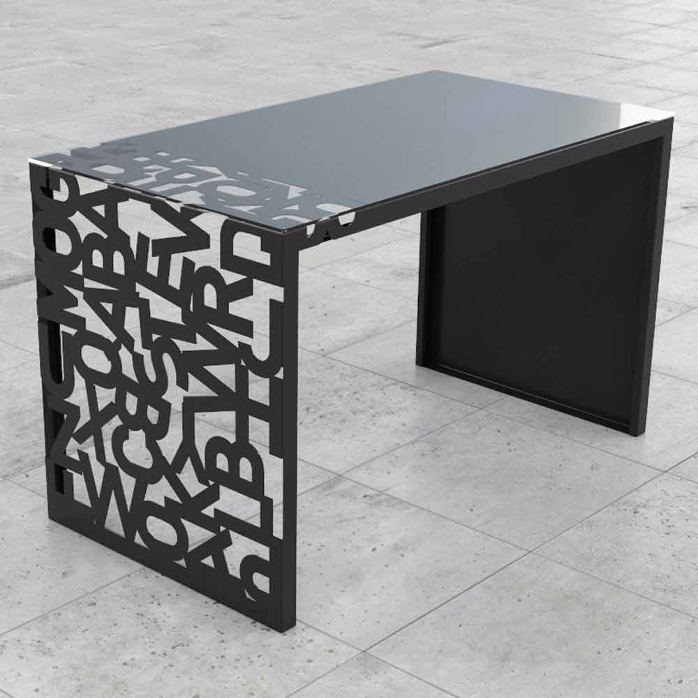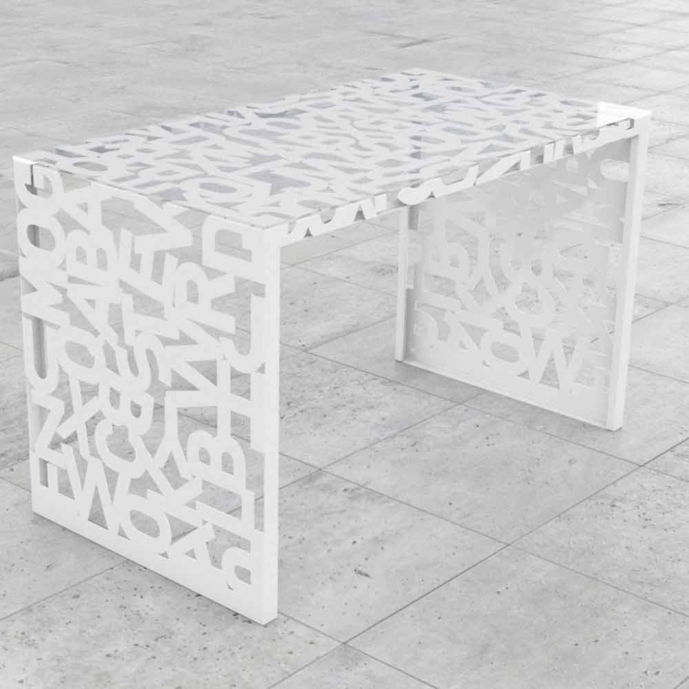 Kattedra surge de una sola hoja de metal doblado y bordado con corte por láser para formar una superficie original de letras. Una mesa con un diseño moderno, visualmente atractiva sino también muy funcional, gracias a la parte superior de vidrio templado. Un mueble perfecto para el estudio, habitación de los niños o de la oficina, Kattedra está disponible en negro, blanco, rojo y antracita.