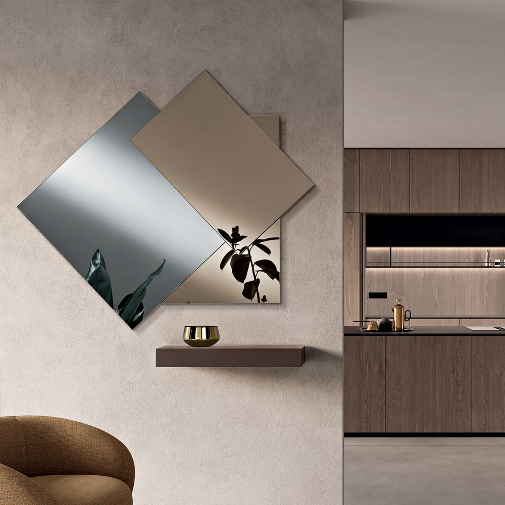 Un elegante espejo de pared de diseño, fabricado en Italia , ideal para realzar espacios como la entrada , el salón o el dormitorio . Su diseño contemporáneo destaca por su composición geométrica, que transforma la superficie reflectante en un elemento decorativo capaz de enriquecer la pared con estilo.
