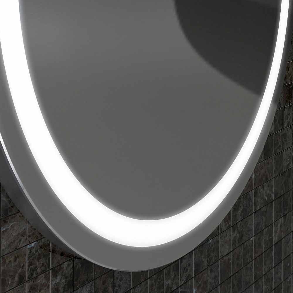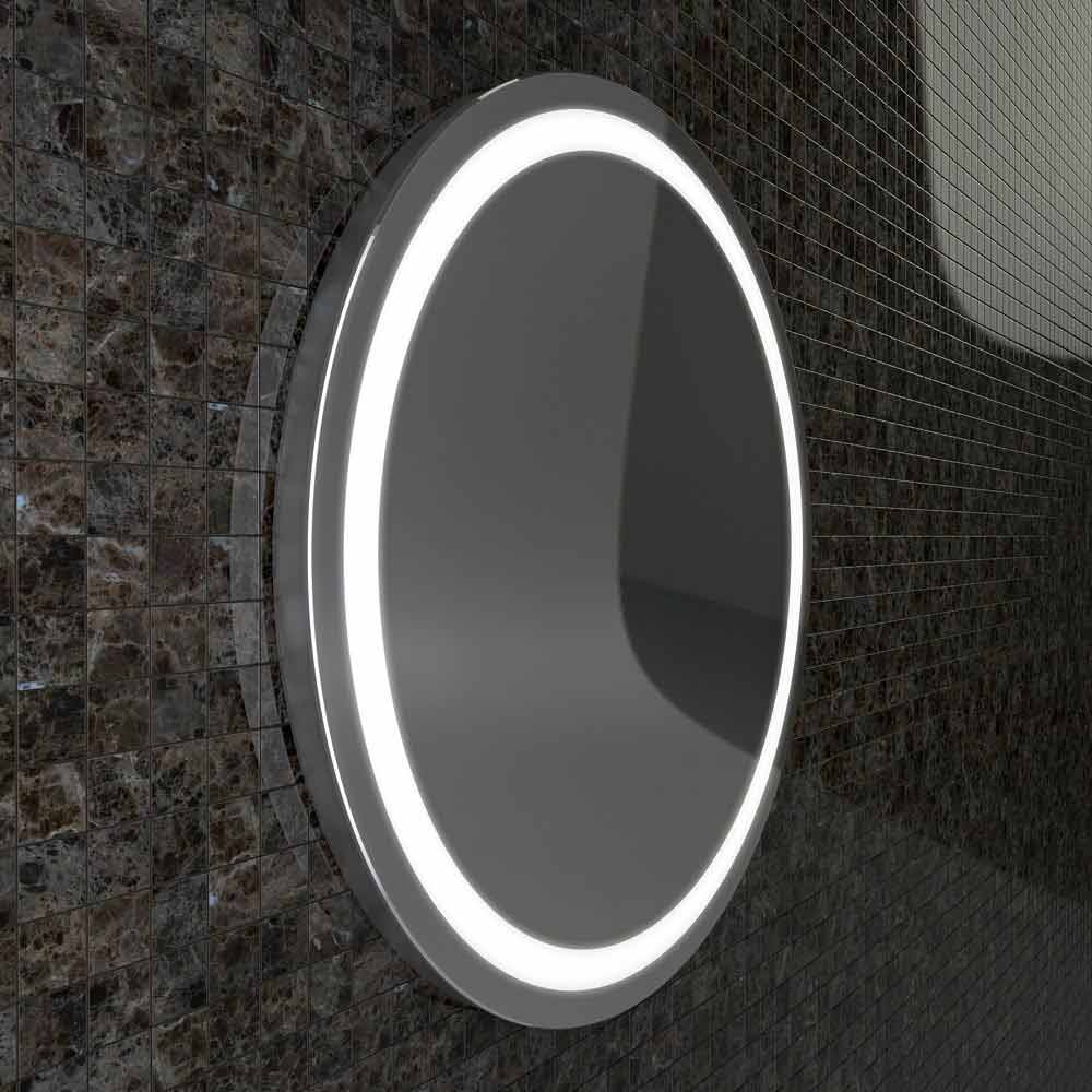 Espejo redondo con iluminación LED integrada en el espejo con bordes de acero inoxidable.