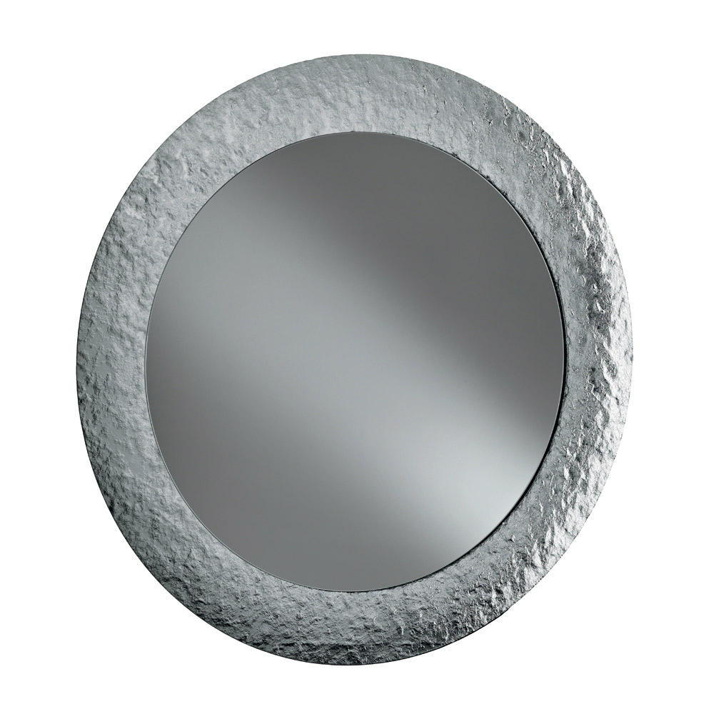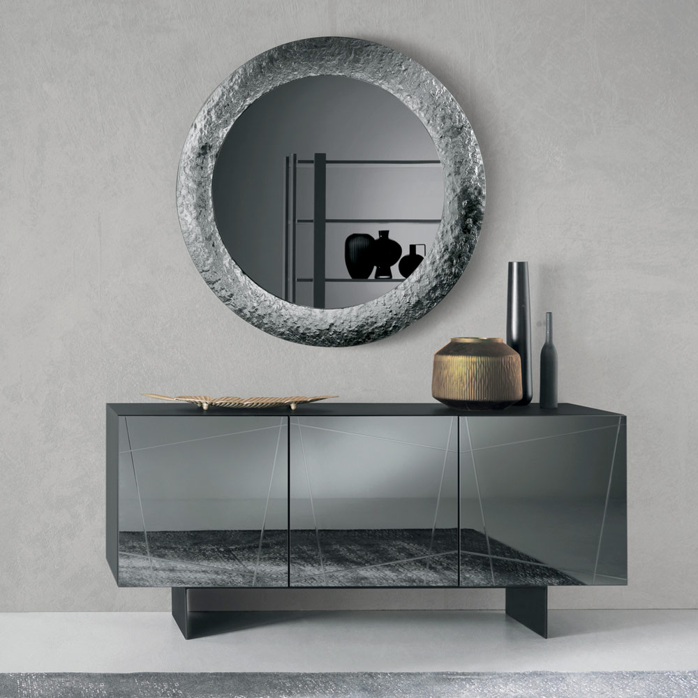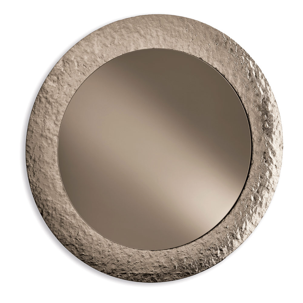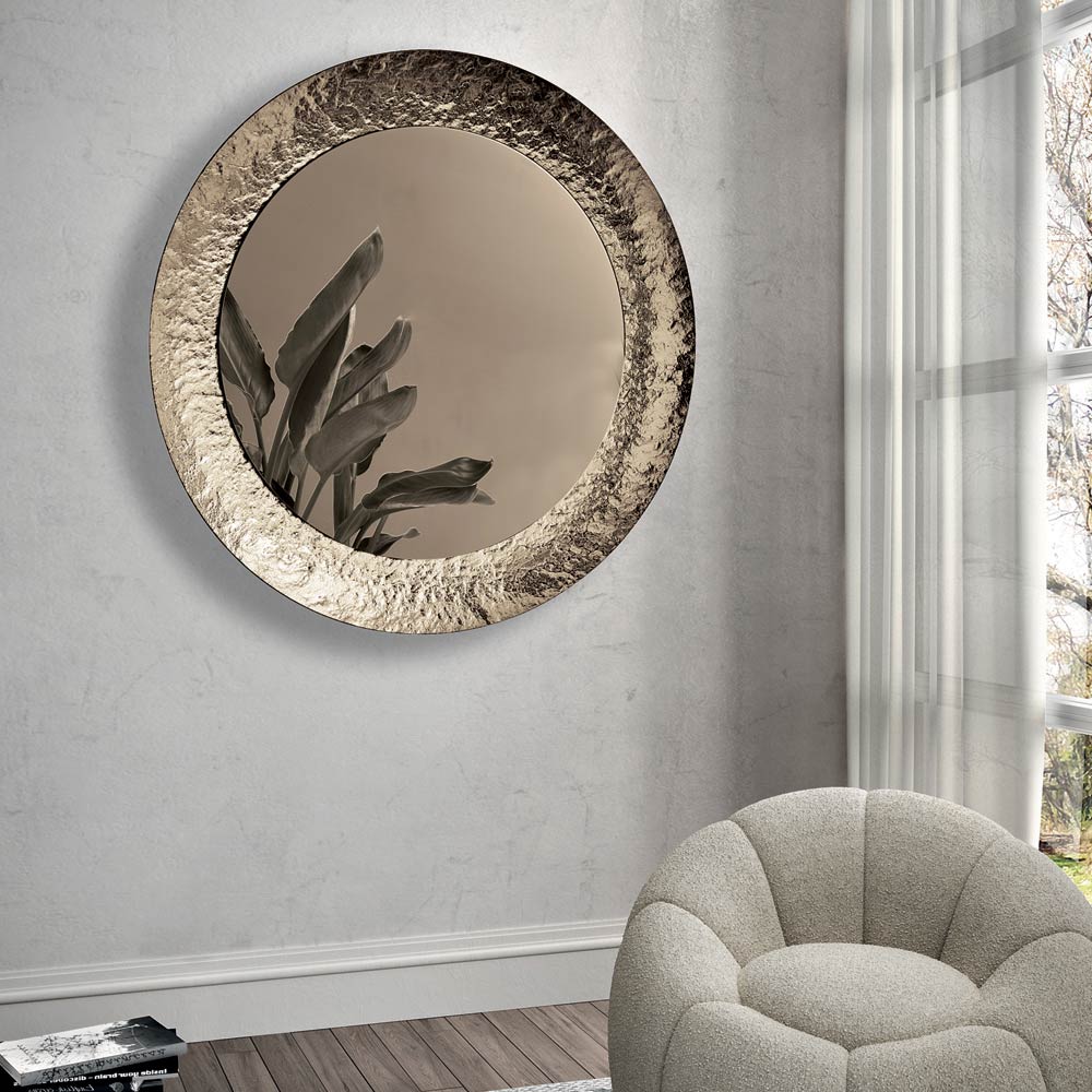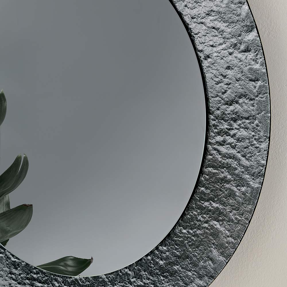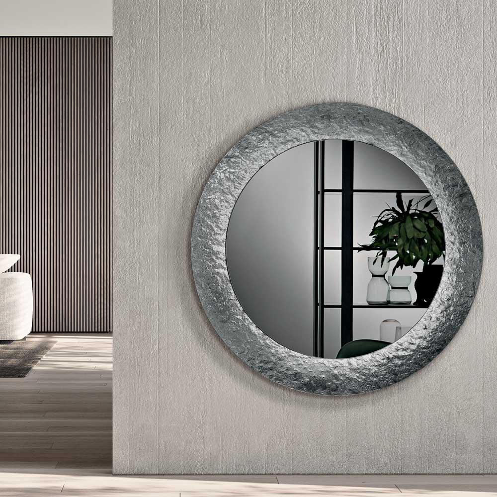 El espejo presenta una forma circular adornada con un marco de cristal martillado plateado en la parte posterior , que le confiere a la superficie una textura vibrante. Su exclusivo acabado refleja la luz con delicadeza, creando un elegante juego de luces y sombras que realza el espacio sin resultar intrusivo.