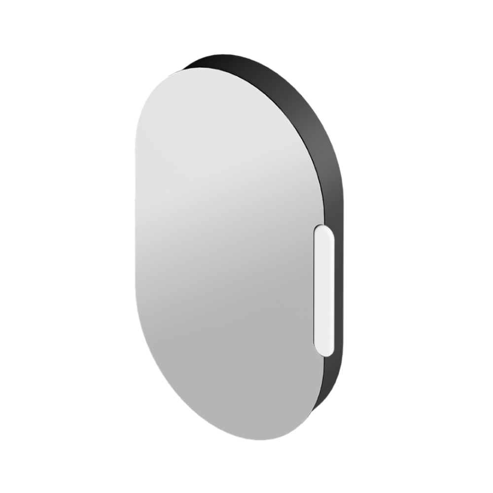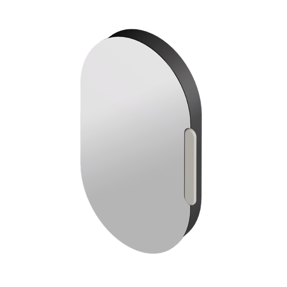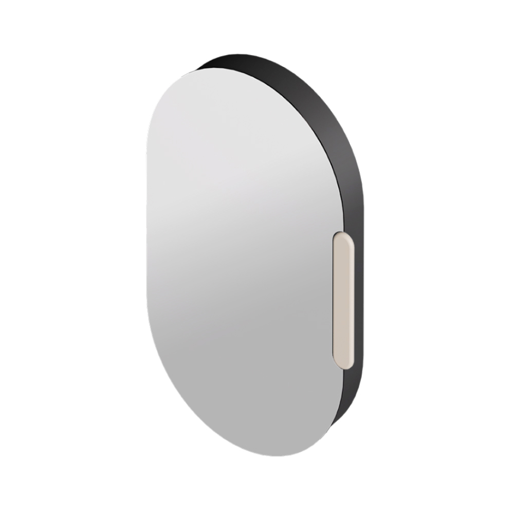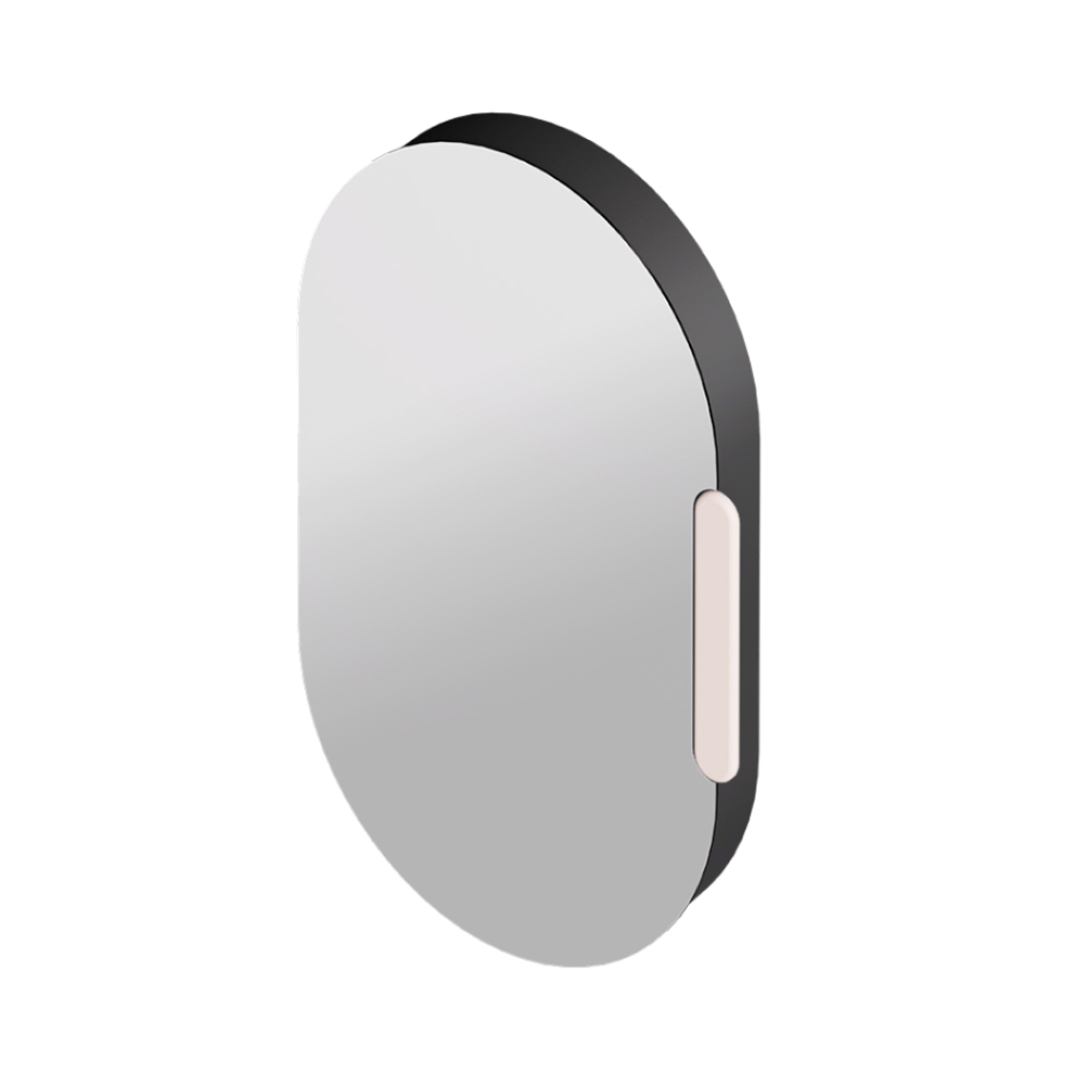 Este espejo de forma ovalada con marco de cerámica no es solo un elemento decorativo, sino también un contenedor inteligente : detrás de la superficie reflectante se esconden prácticos compartimentos abiertos, ideales para organizar con elegancia pequeños objetos cotidianos.