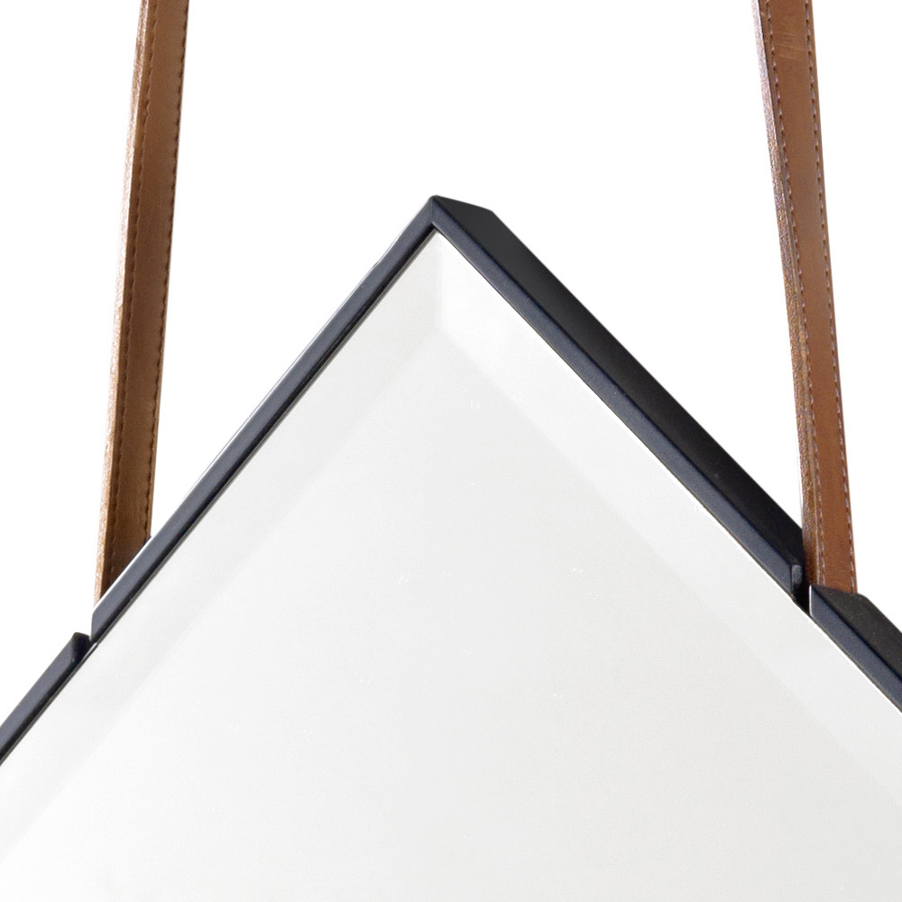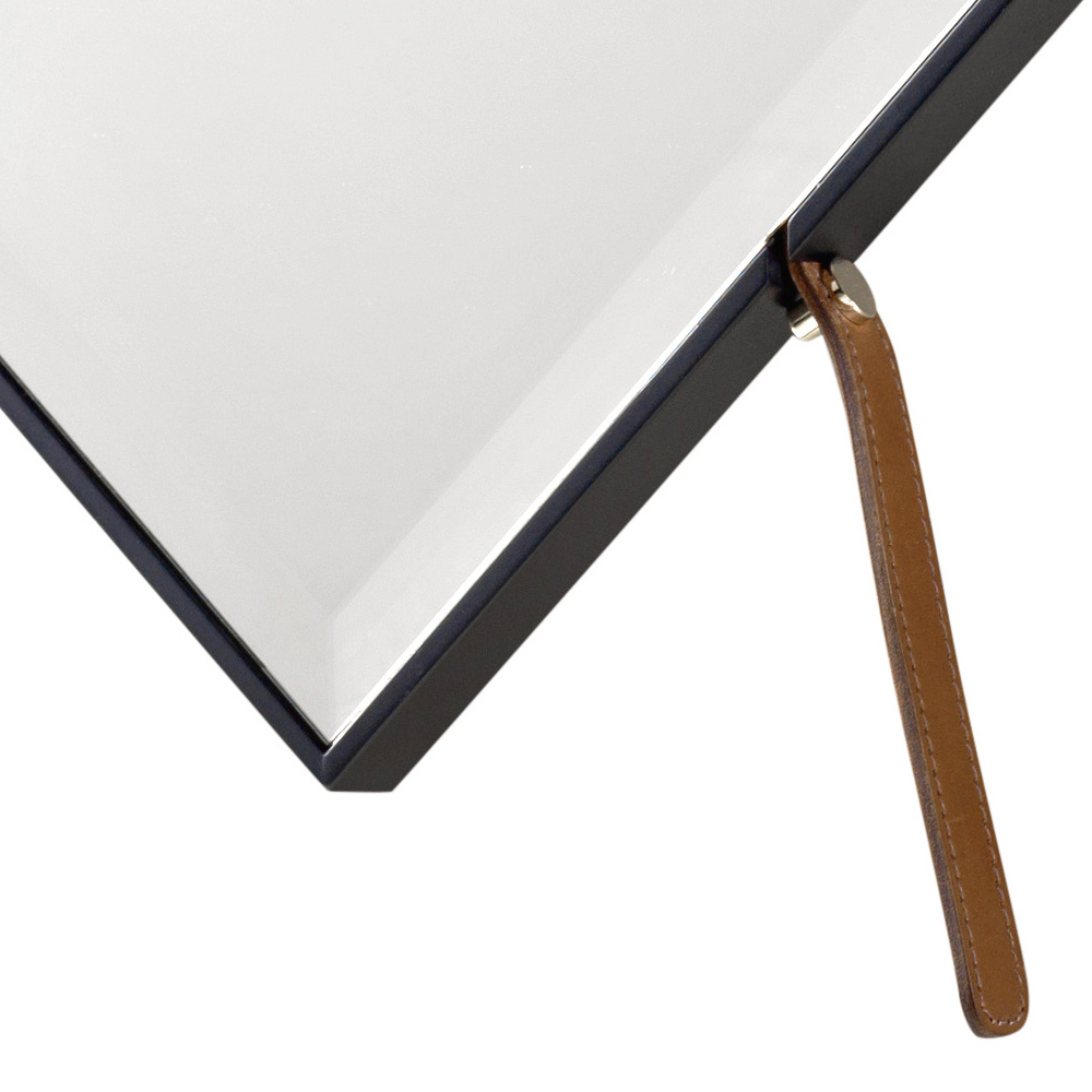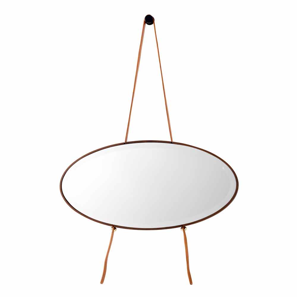 El espejo York tiene un diseño único y elegante, hecho con un marco de madera maciza en nogal canaletto y un cinturón de cuero para un soporte ajustable en altura.