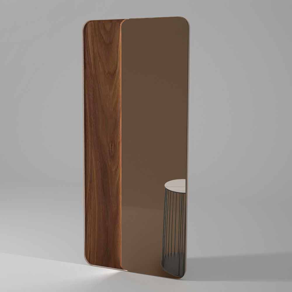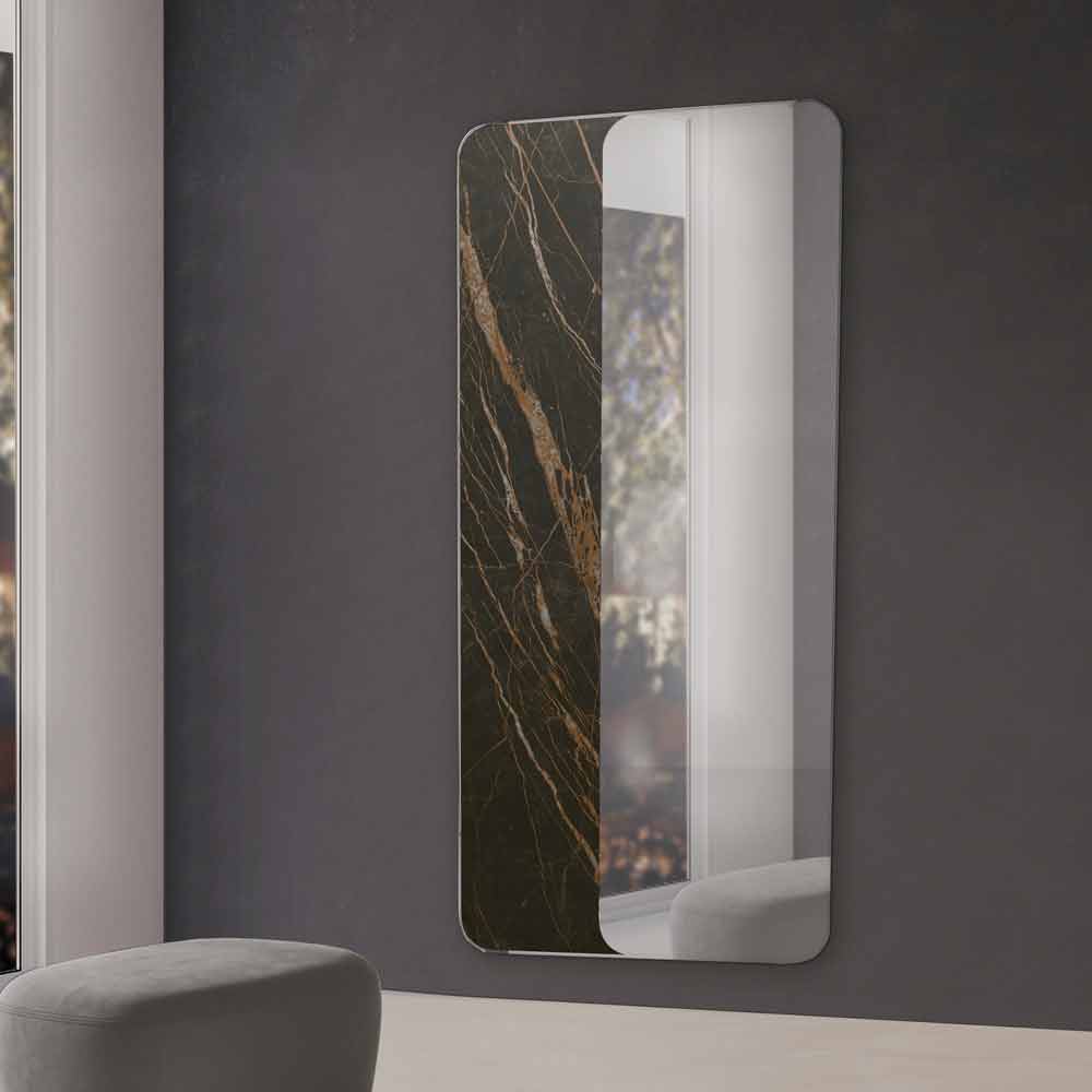 Espejo de pared íntegramente fabricado en Italia que consta de un anillo exterior en metal y un inserto lateral en cerámica o madera completado por un espejo superpuesto en acabado bronce o plata. Un
