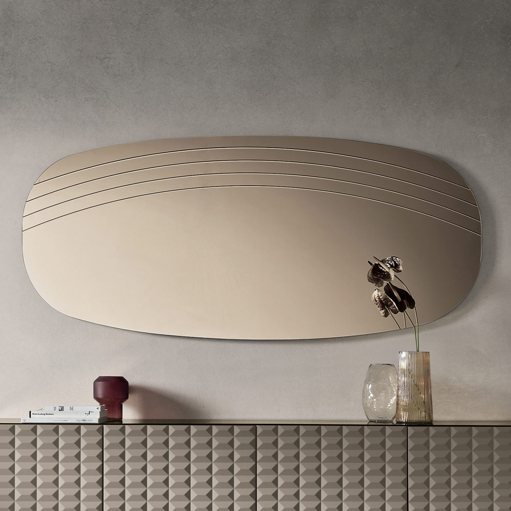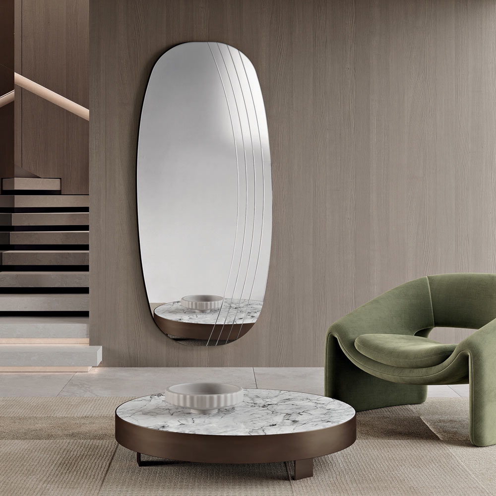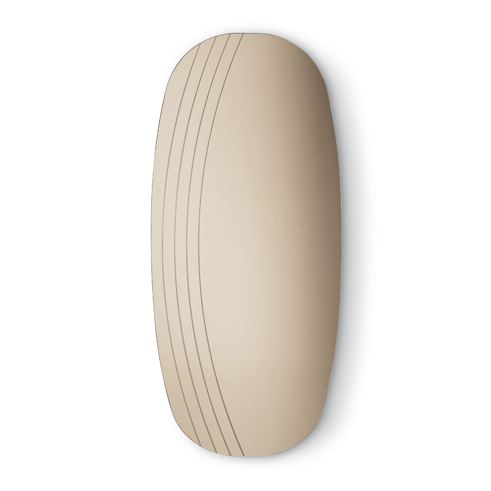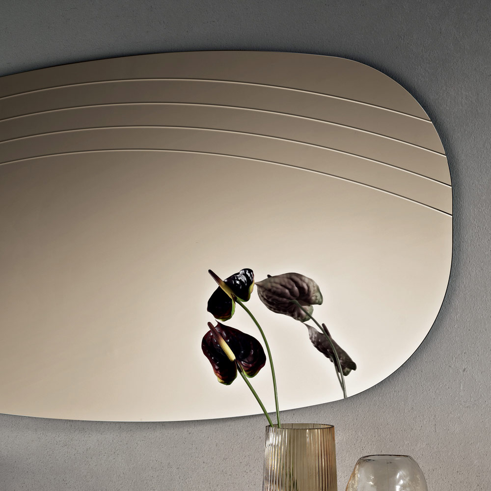 La superficie reflectante se ve realzada por delicadas incisiones laterales que siguen el perfil sinuoso del espejo, creando un refinado juego de luz y textura. Este detalle decorativo añade profundidad visual y enfatiza la armonía de las formas, confiriendo al espejo un aire sofisticado y moderno.