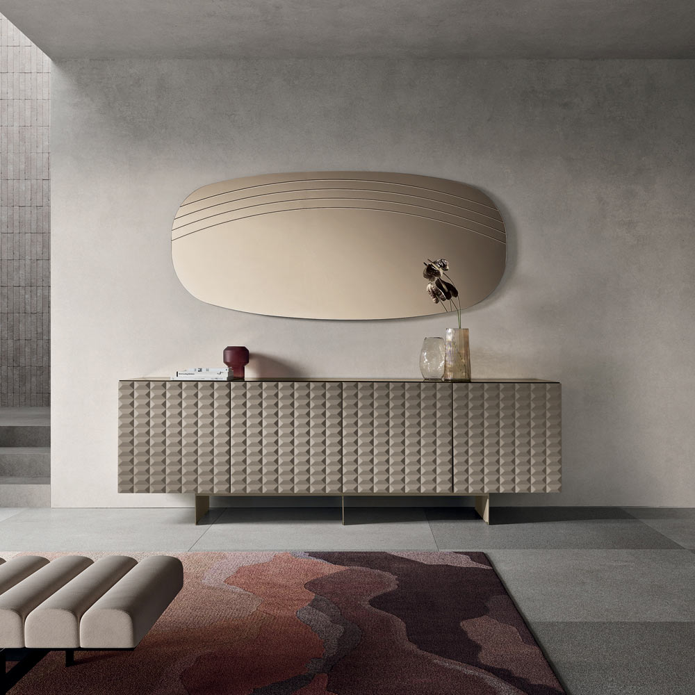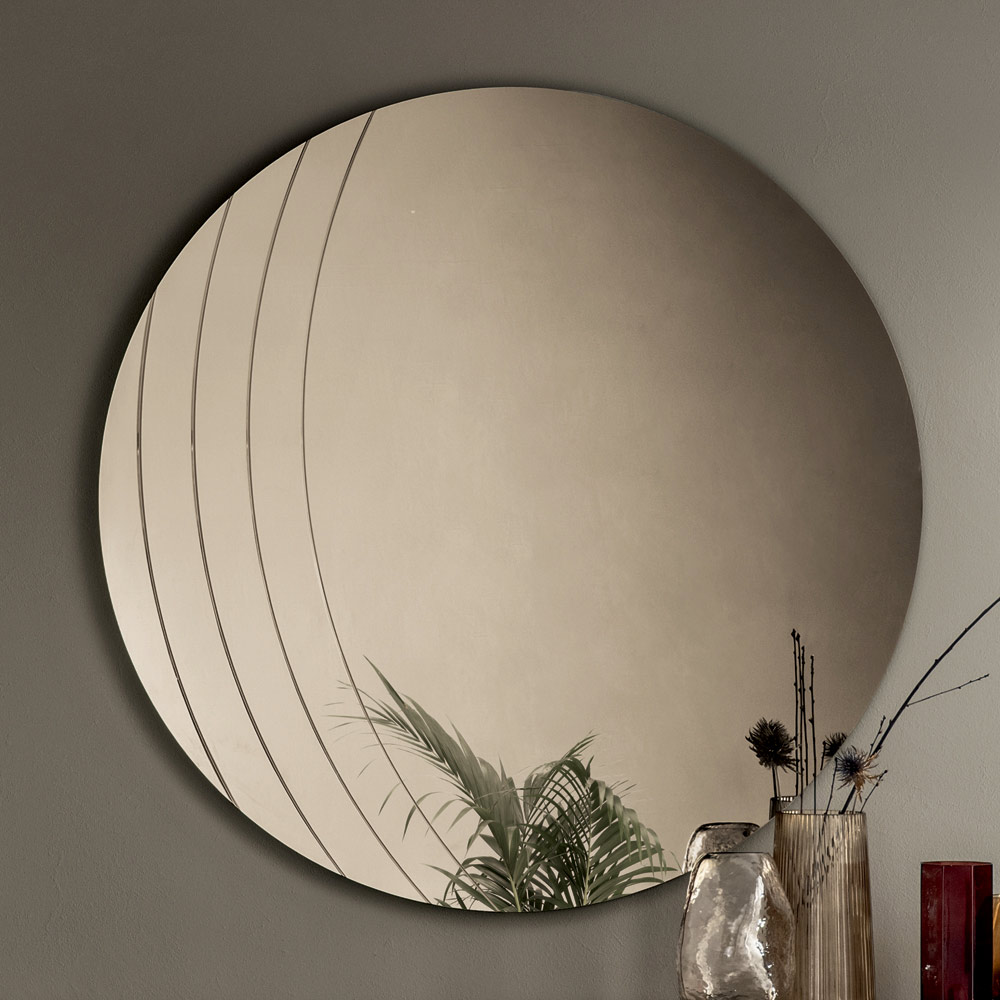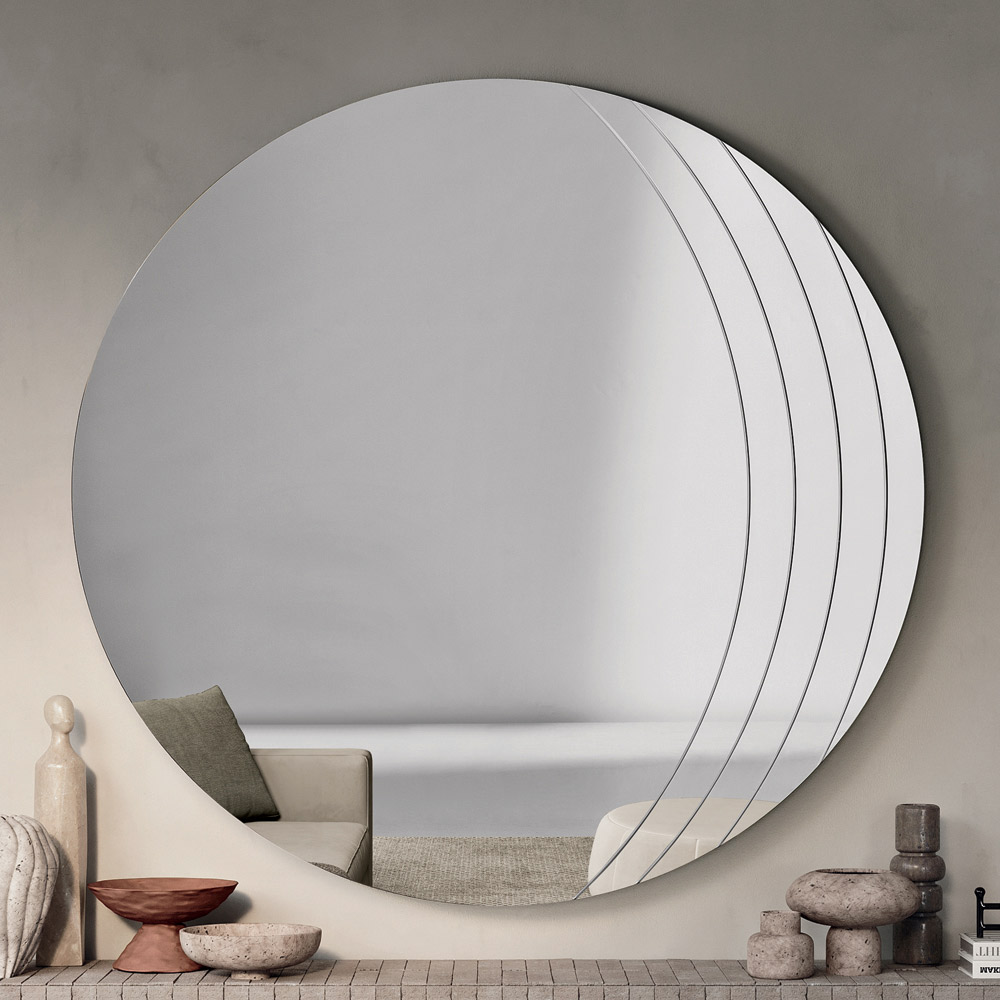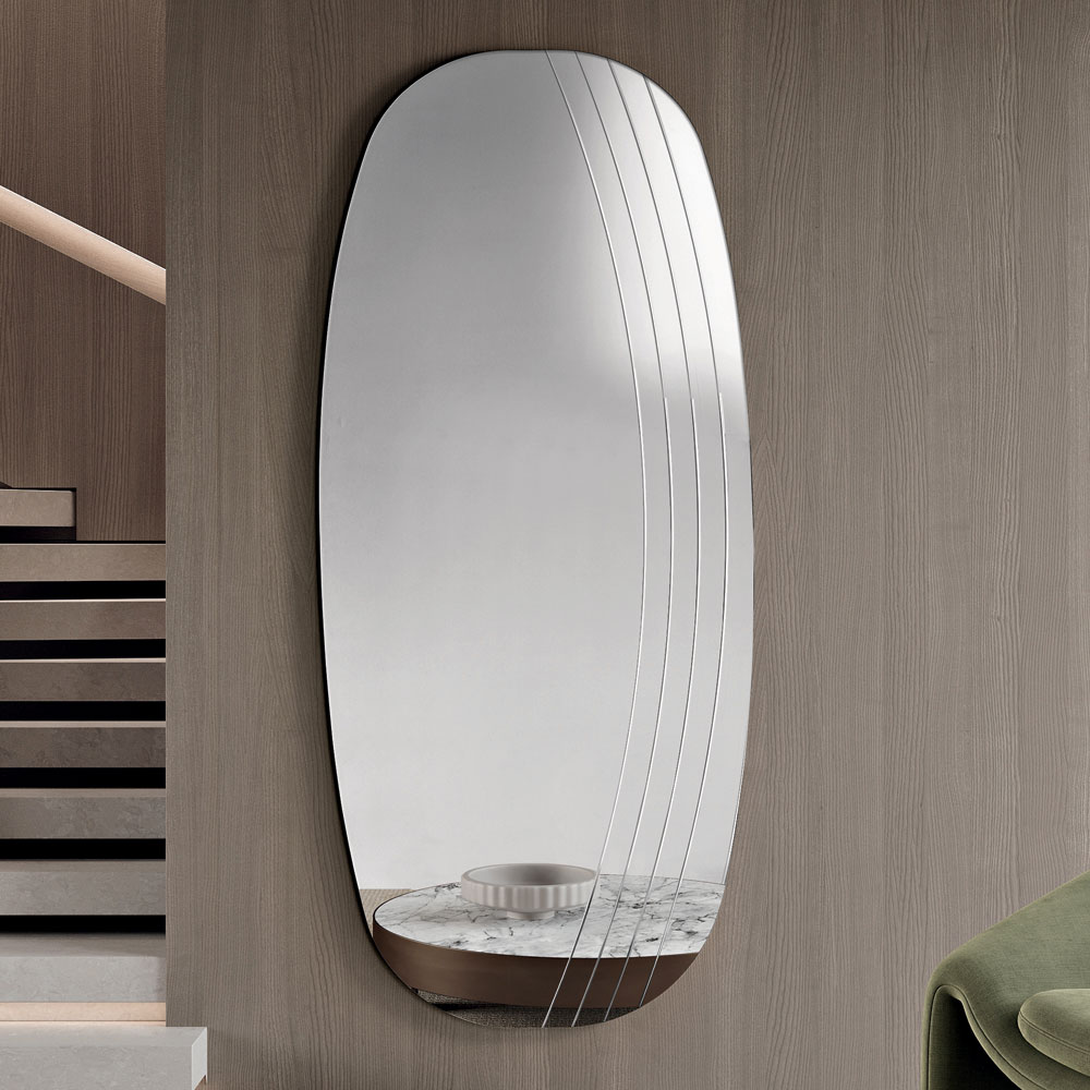La superficie reflectante se ve realzada por delicadas incisiones laterales que siguen el perfil sinuoso del espejo, creando un refinado juego de luz y textura. Este detalle decorativo añade profundidad visual y enfatiza la armonía de las formas, confiriendo al espejo un aire sofisticado y moderno.