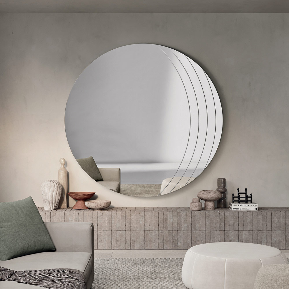 Disponible en varios tamaños y formas —dos versiones circulares y una rectangular con esquinas redondeadas—, el espejo se adapta fácilmente a diversos contextos de decoración, convirtiéndose en un elegante complemento para espacios contemporáneos y sofisticados.