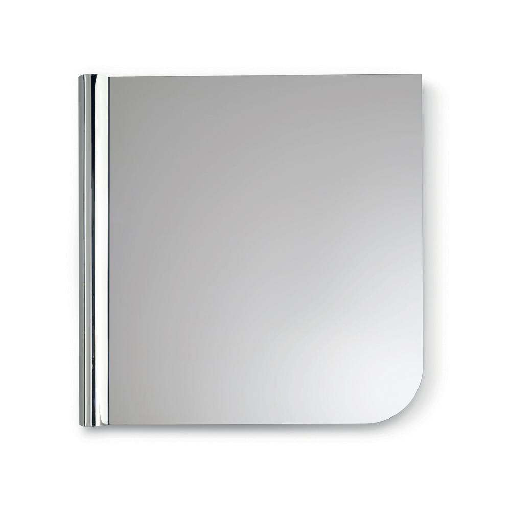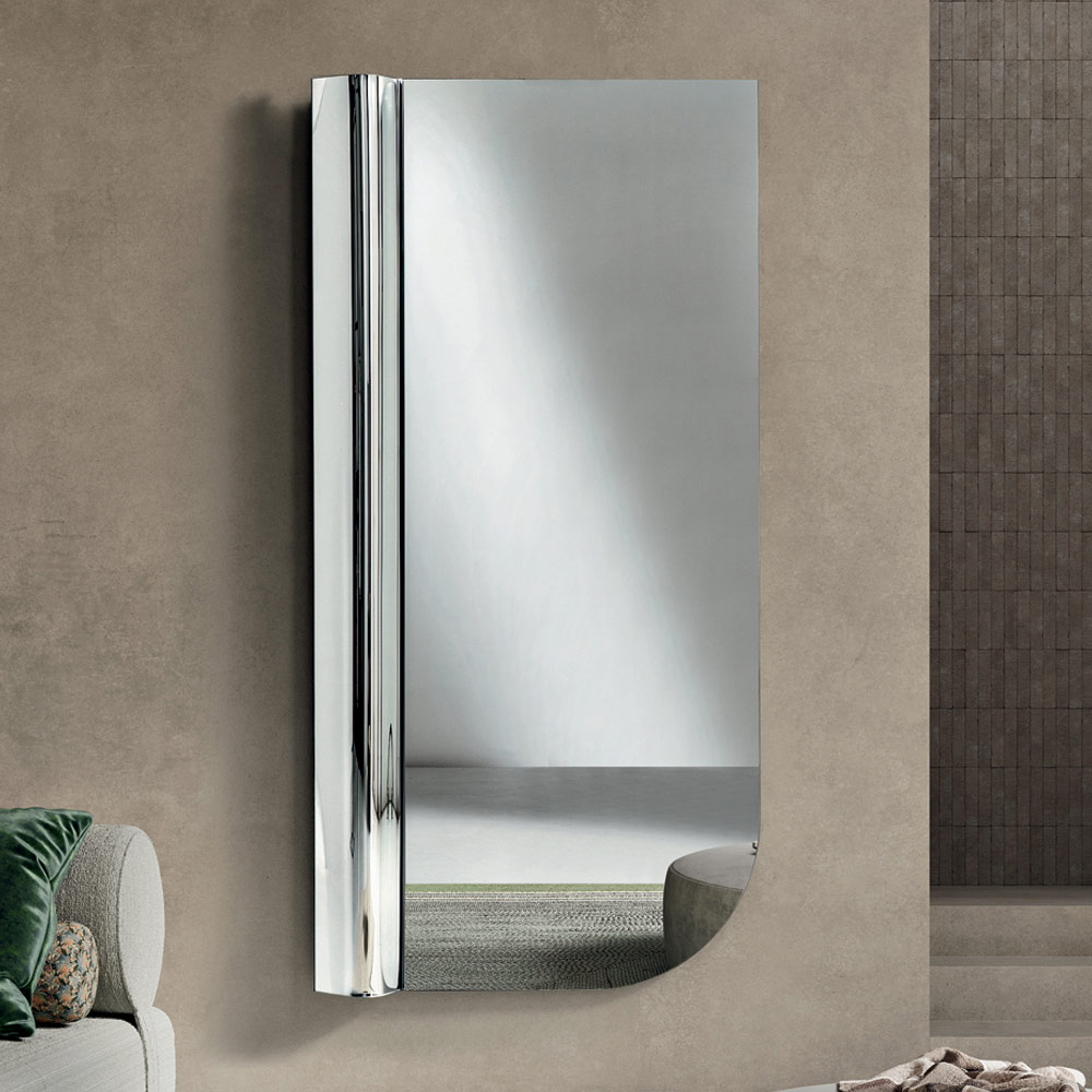 La forma del espejo se caracteriza por líneas puras con una esquina redondeada que suaviza el perfil del cristal. En contraste con esta geometría esencial, una onda de vidrio fundido recorre uno de sus lados verticales, un detalle texturizado que aporta dinamismo a la superficie y crea un elegante juego de luces y reflejos.