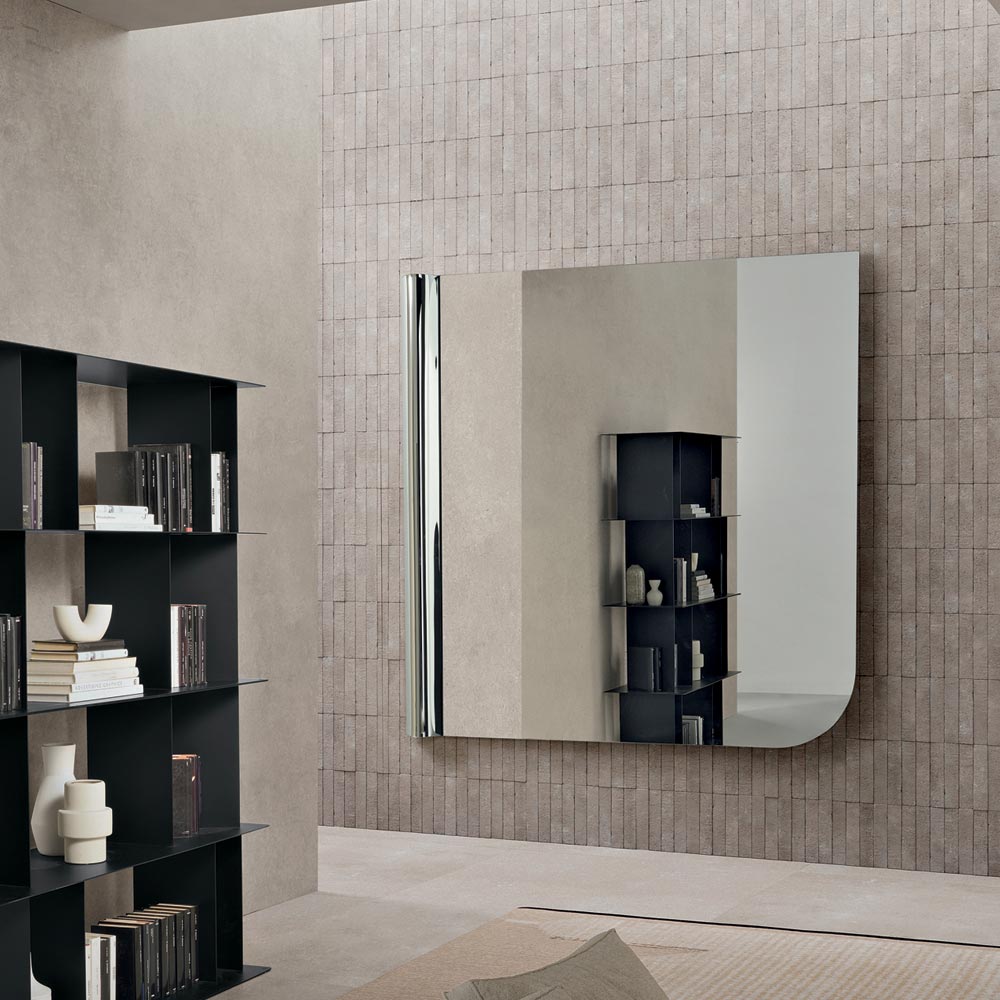 El equilibrio entre la sutil asimetría y las líneas esenciales convierte a este espejo en un sofisticado accesorio de decoración, capaz de enriquecer la pared con un toque gráfico moderno y de potenciar la luminosidad de la habitación.