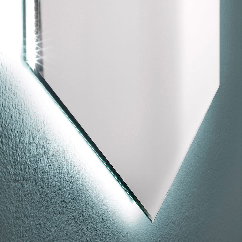 Espejo de pared para baño moderno de forma hexagonal con bordes biselados y retroiluminación LED, fabricado en Italia.