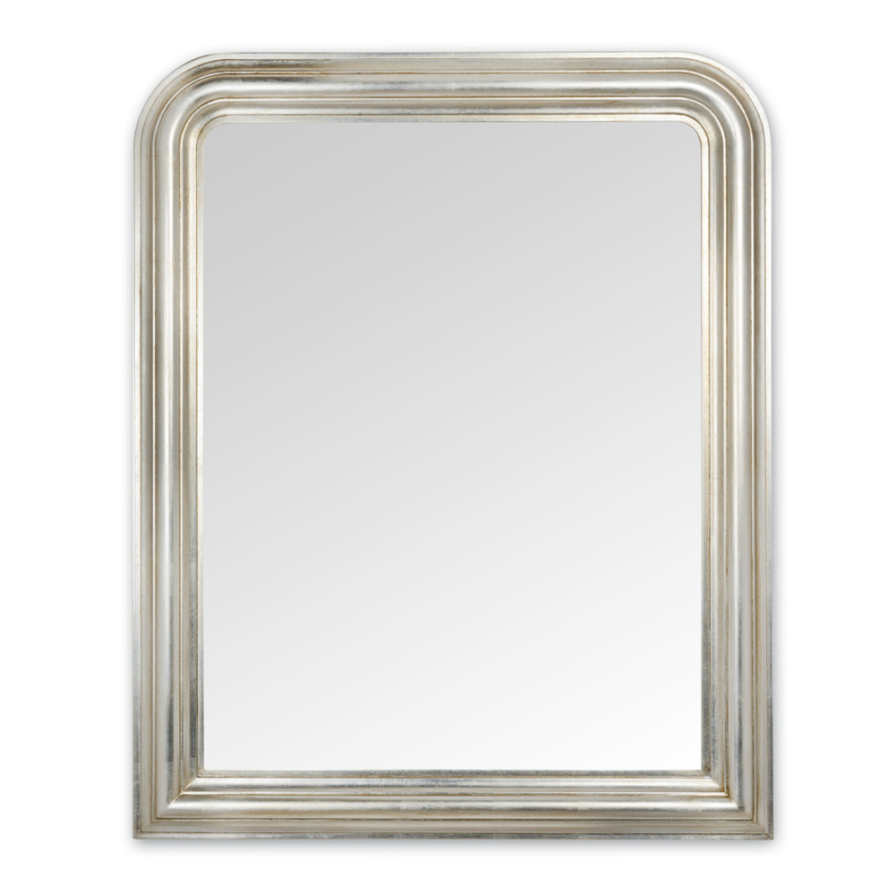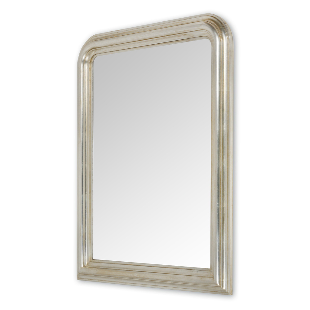 Espejo de cristal y madera con acabado en pan de plata Made in Italy.