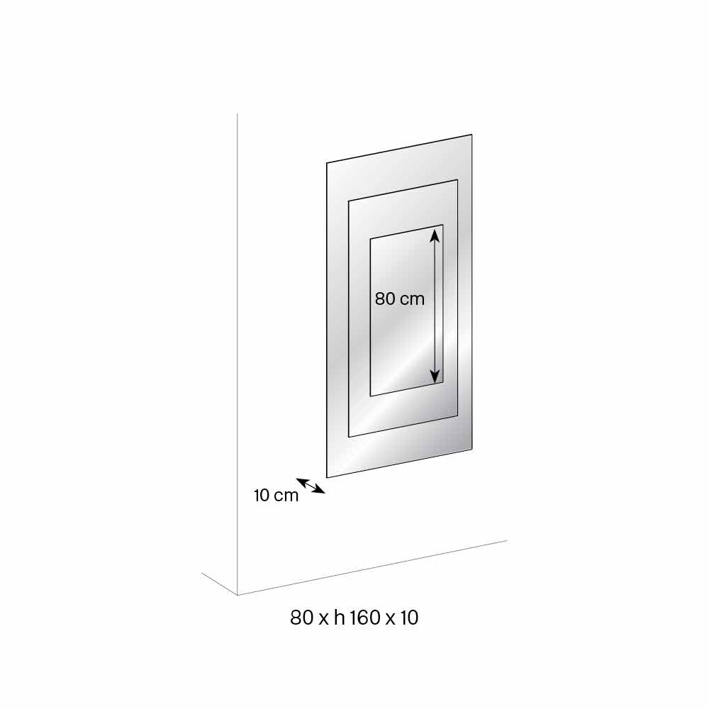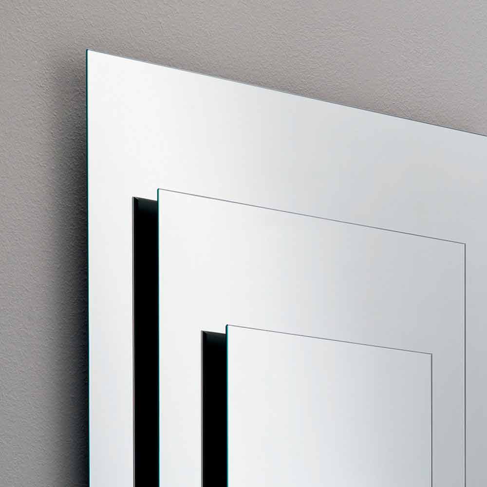 Este espejo de pared está formado por tres placas superpuestas y espaciadas sostenidas por una estructura de madera negra .