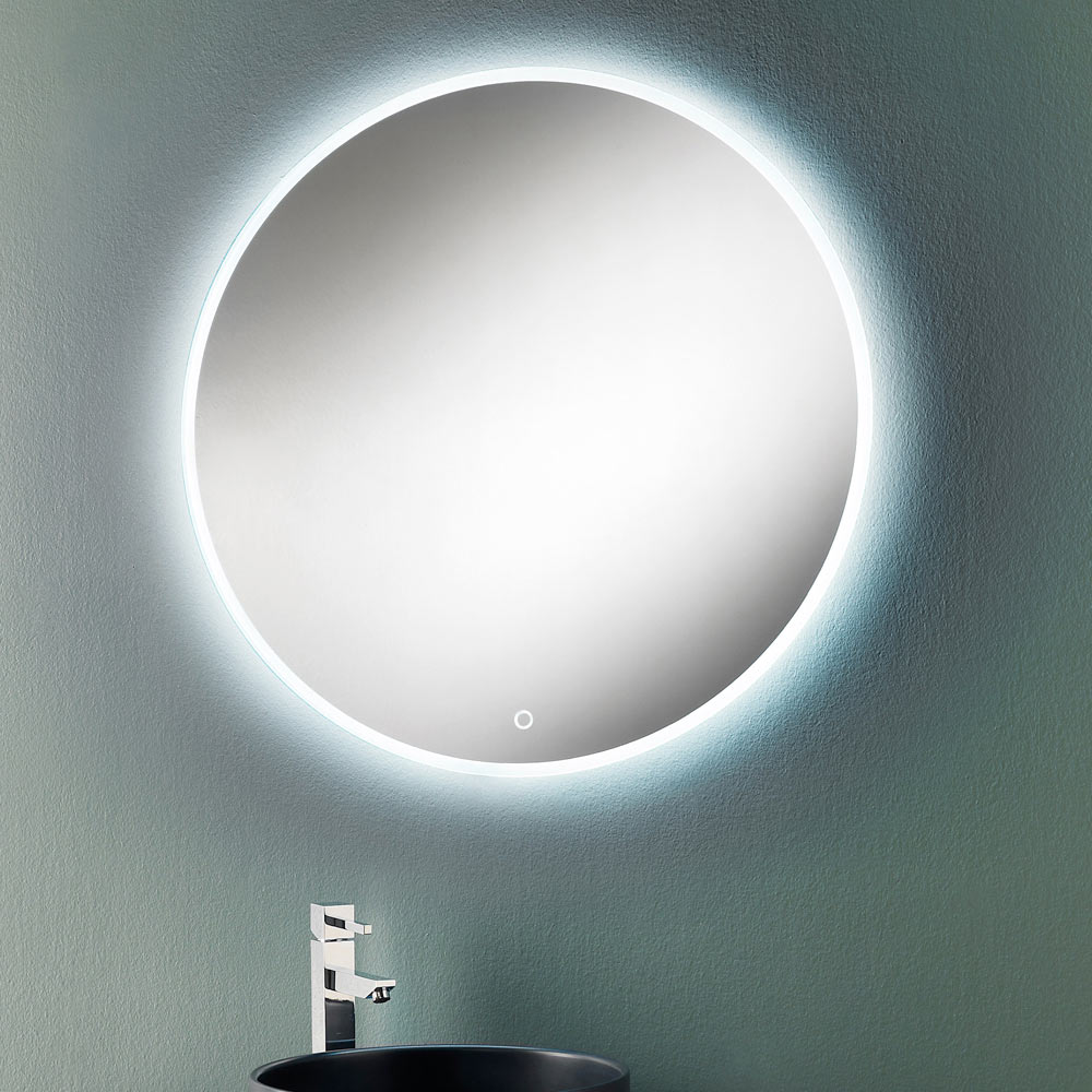 Espejo de baño de pared redondo de diseño moderno con borde arenado y retroiluminado, fabricado en Italia.