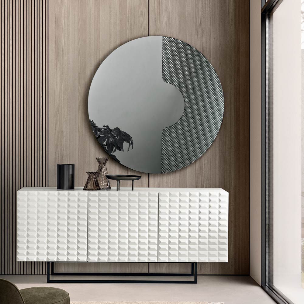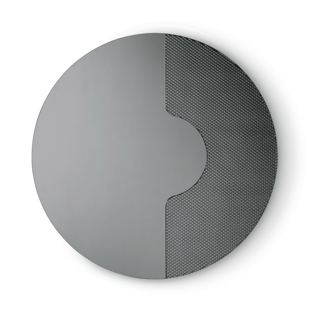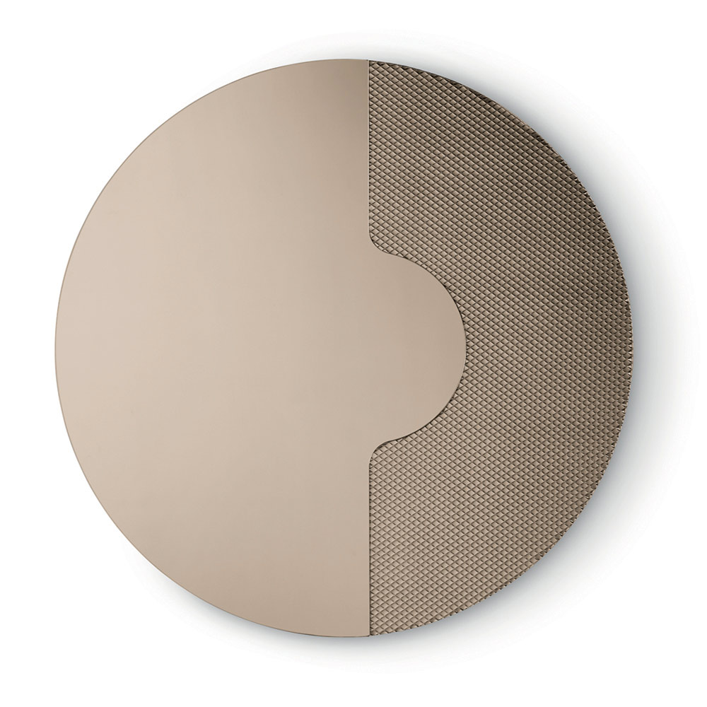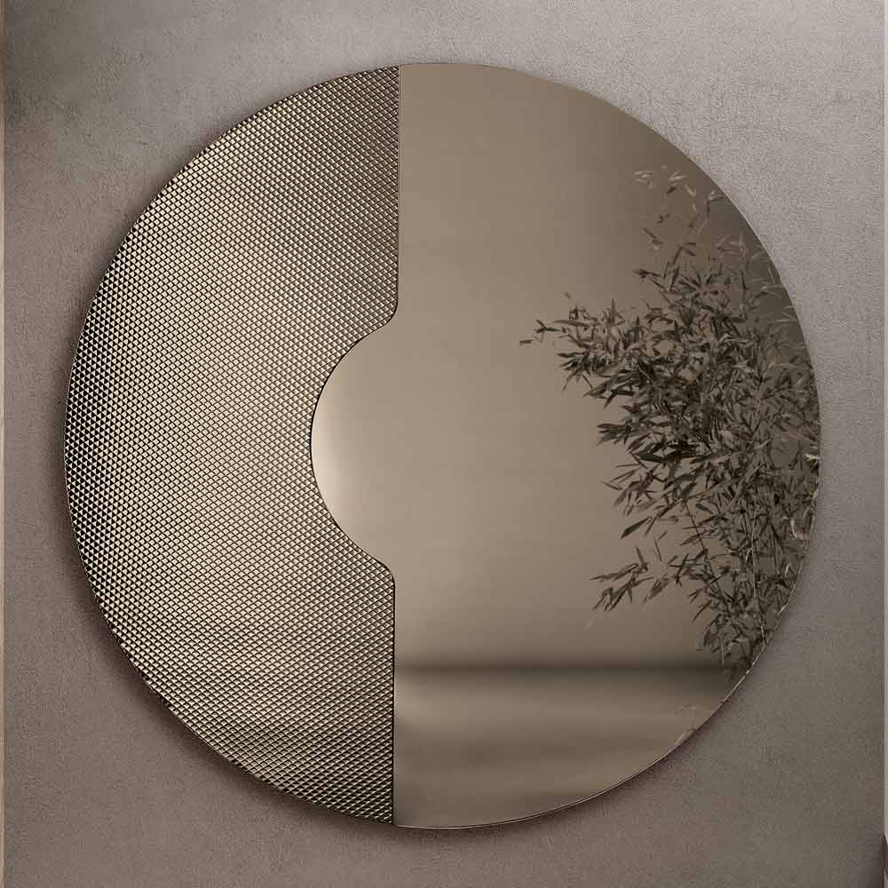 El espejo redondo incorpora un inserto lateral de cristal tono sobre tono grabado con un patrón de malla gráfica . Este elemento decorativo sostiene el panel espejado como si descansara sobre él, creando un refinado efecto tridimensional y un elegante juego de grosores y reflejos.