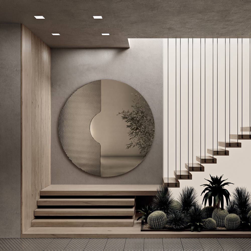 Gracias a su equilibrio entre geometría y textura, este espejo se convierte en un sofisticado elemento decorativo capaz de añadir profundidad y luminosidad a la pared, adaptándose perfectamente a ambientes modernos y contemporáneos.