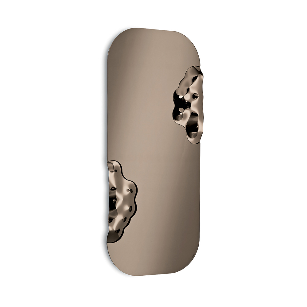 La superficie rectangular con esquinas redondeadas aporta equilibrio y ligereza visual a la composición. Dos elementos de vidrio texturizado tono sobre tono se insertan en los laterales del espejo, colocados simétricamente en los lados verticales, añadiendo textura y profundidad al diseño y creando un elegante contraste entre superficies lisas y texturas elaboradas.