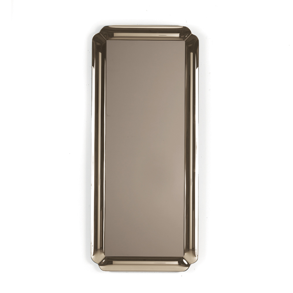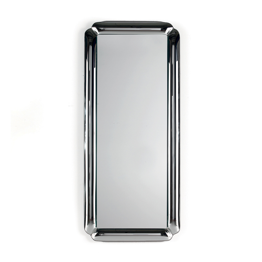 El espejo presenta una forma rectangular adornada con un marco de cristal fundido tono sobre tono con esquinas delicadamente perfiladas . La placa reflectante descansa sobre el marco, creando un refinado juego de profundidad que realza la superficie y aporta ligereza a la composición.