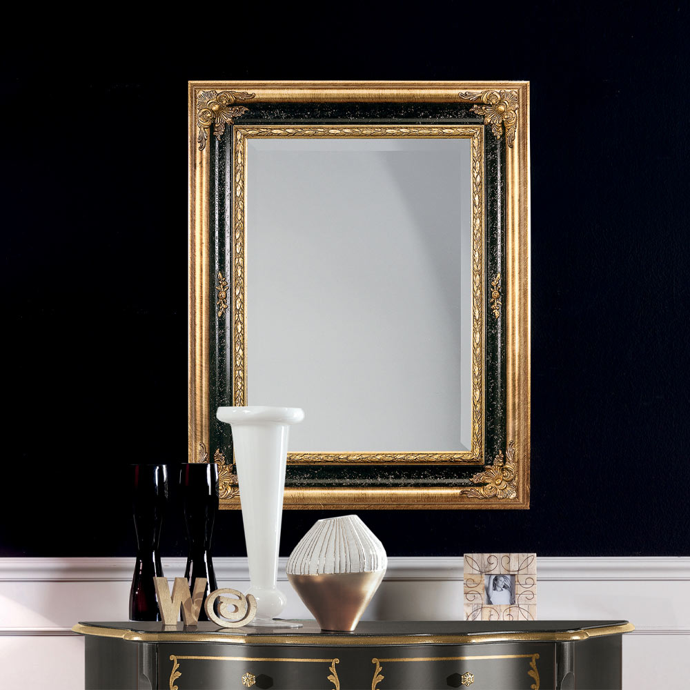 Elegante espejo rectangular con marco de madera decorado con pan de oro y laca negra. Gracias a su estilo clásico , este espejo es ideal para dar un toque elegante y lujoso a cualquier estancia.