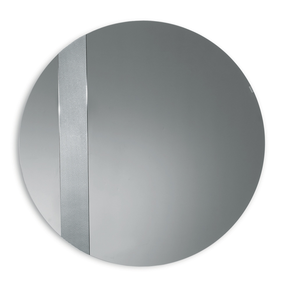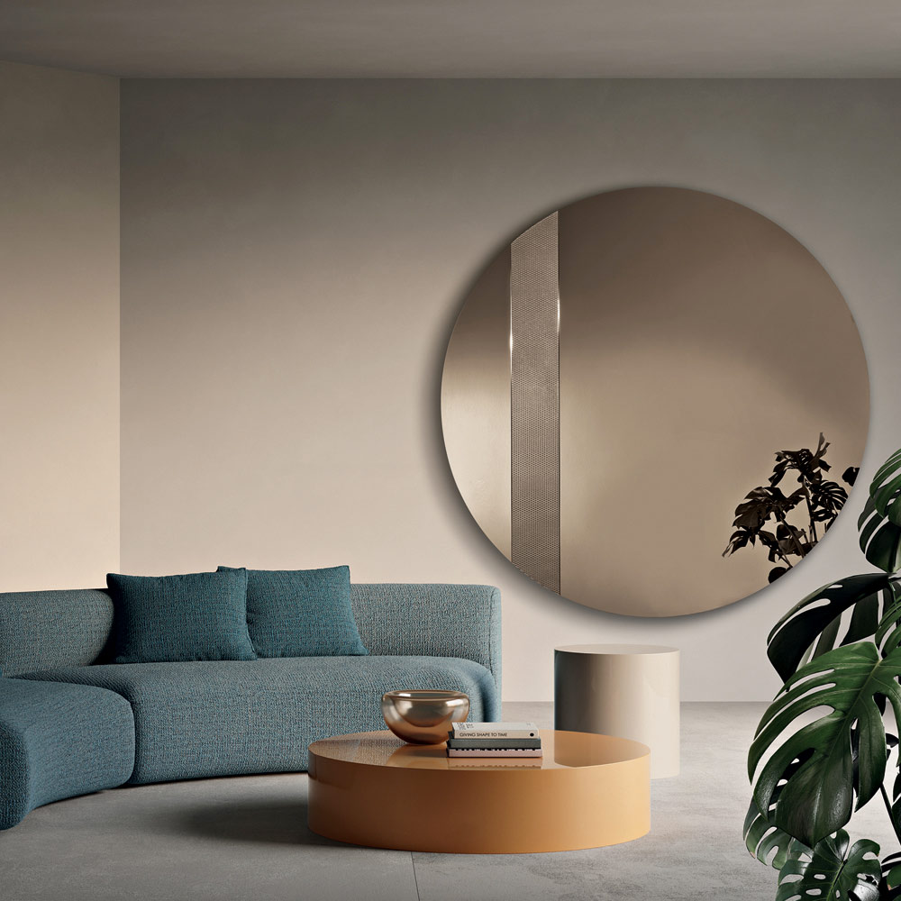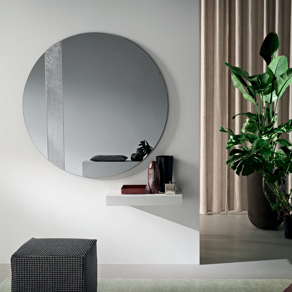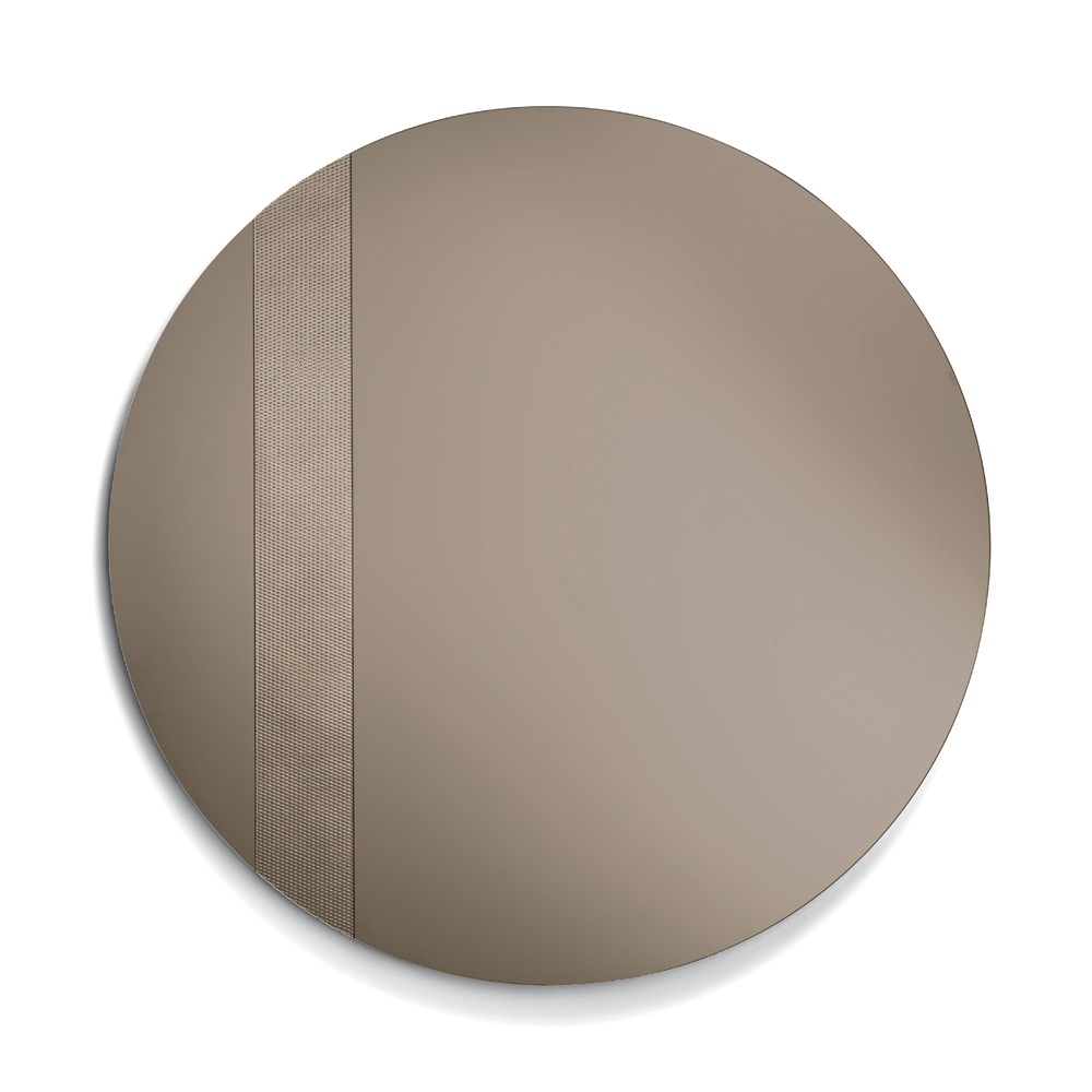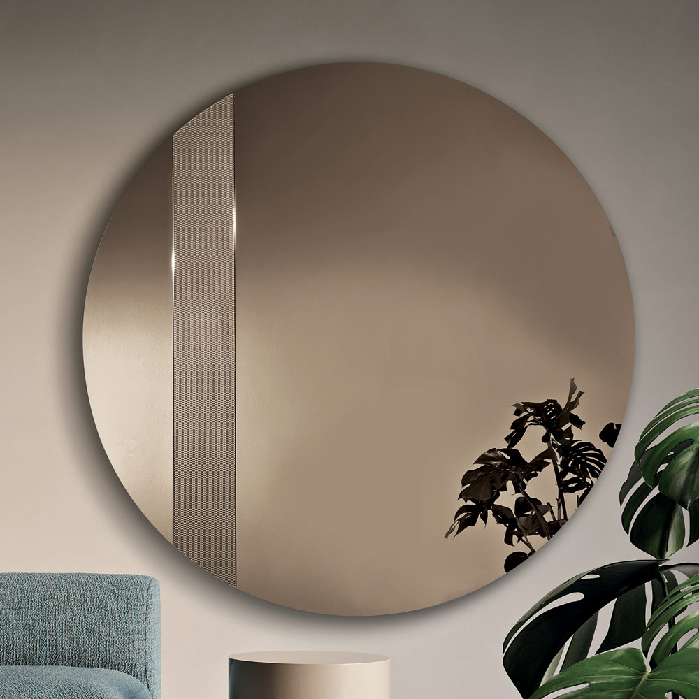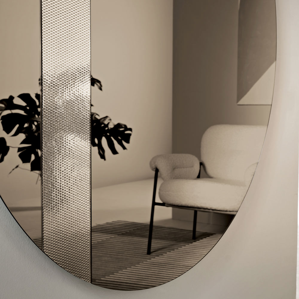 El espejo presenta una forma redonda adornada con un inserto lateral de cristal con una decoración de malla tono sobre tono . Este detalle gráfico captura la luz y crea un elegante juego de reflejos, añadiendo profundidad y dinamismo a la superficie reflectante.