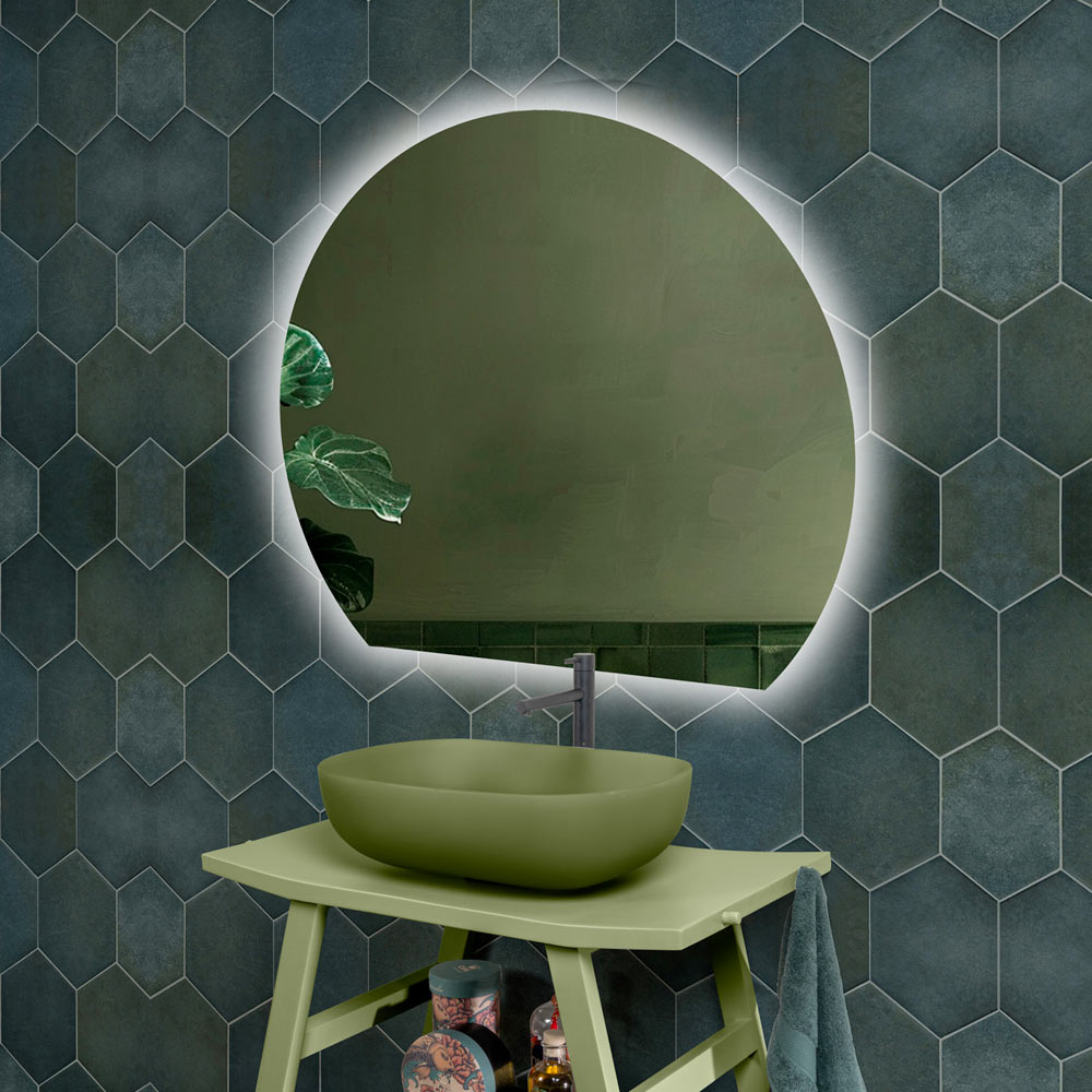 La luz LED integrada , distribuida uniformemente a lo largo del perímetro, crea un efecto suave que realza la pureza de la forma circular y contribuye a una atmósfera acogedora y refinada. Perfecta para el cuidado personal, proporciona una iluminación funcional y a la vez evocadora.