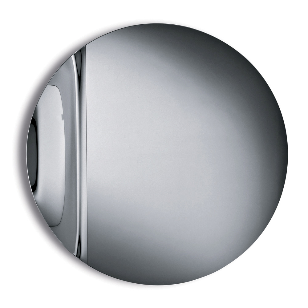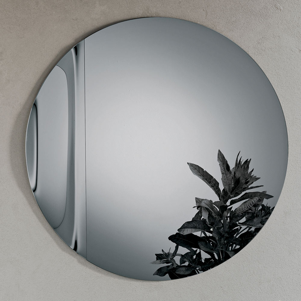 El espejo presenta una forma redonda elaborada en vidrio fundido , adornada con una onda lateral que interrumpe elegantemente la simetría perfecta del círculo. Este sutil detalle crea un refinado juego de reflejos y le confiere al espejo una apariencia escultural a la vez que ligera.