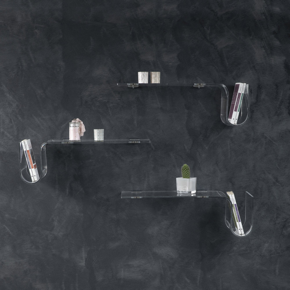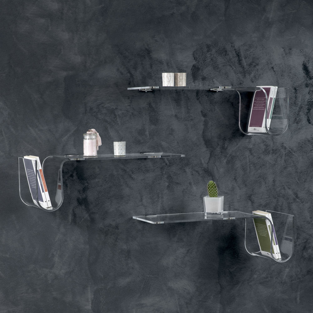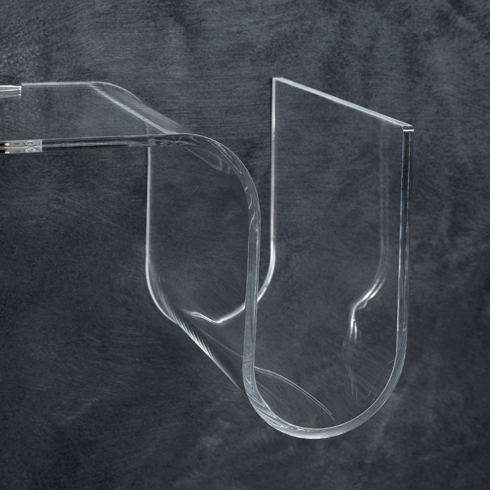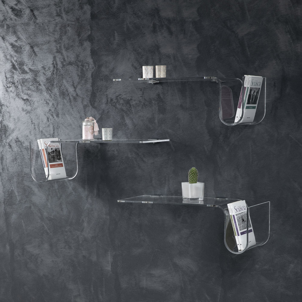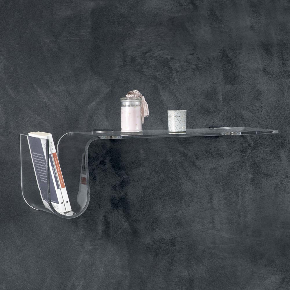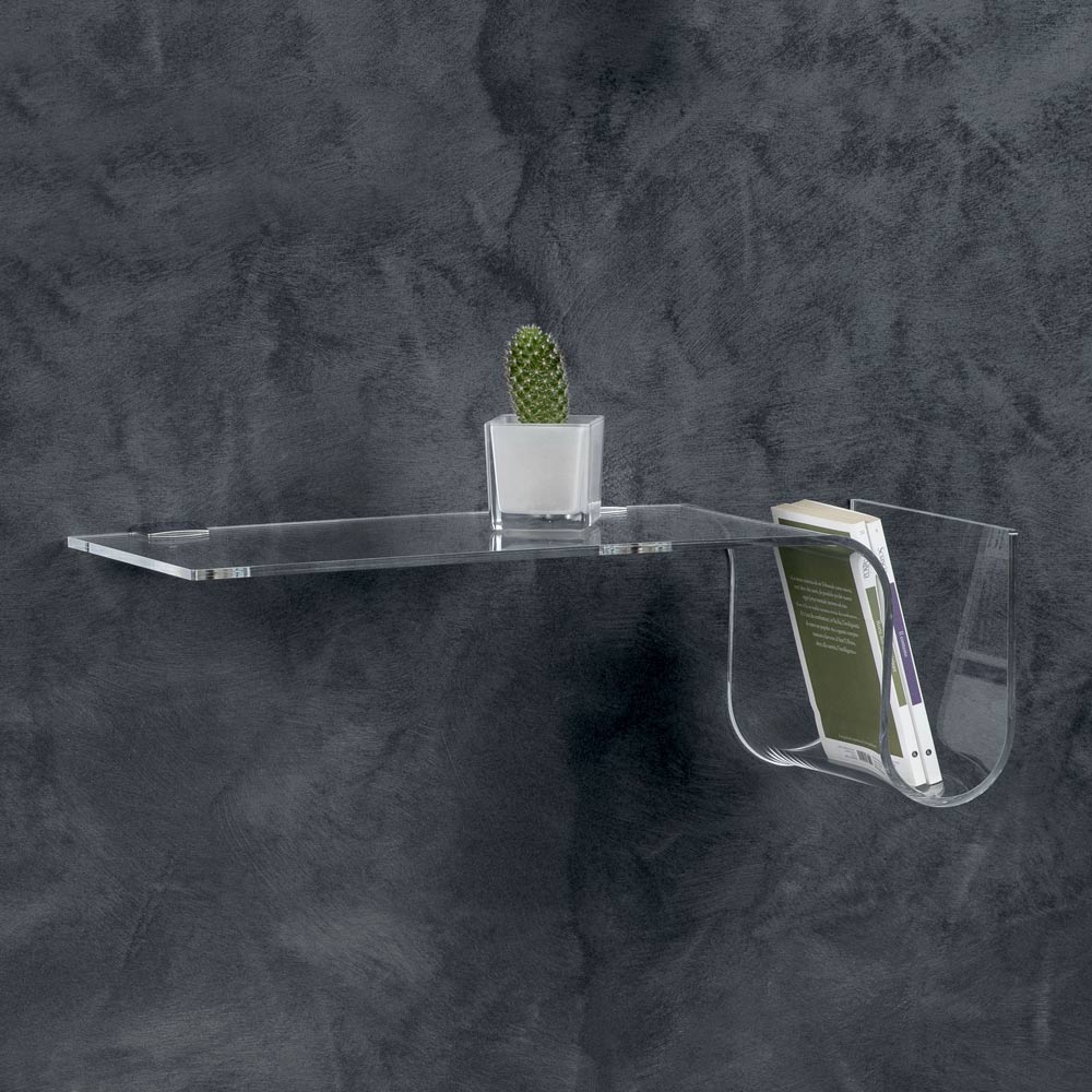 Esta balda de pared está realizada íntegramente en cristal acrílico transparente de 8 mm de espesor , disponible en versión derecha o izquierda.