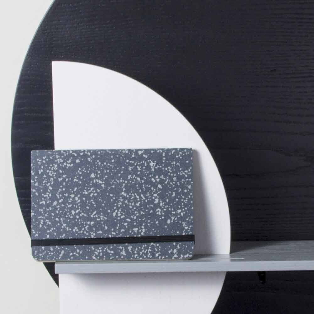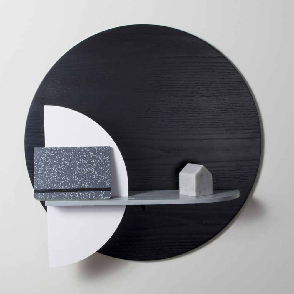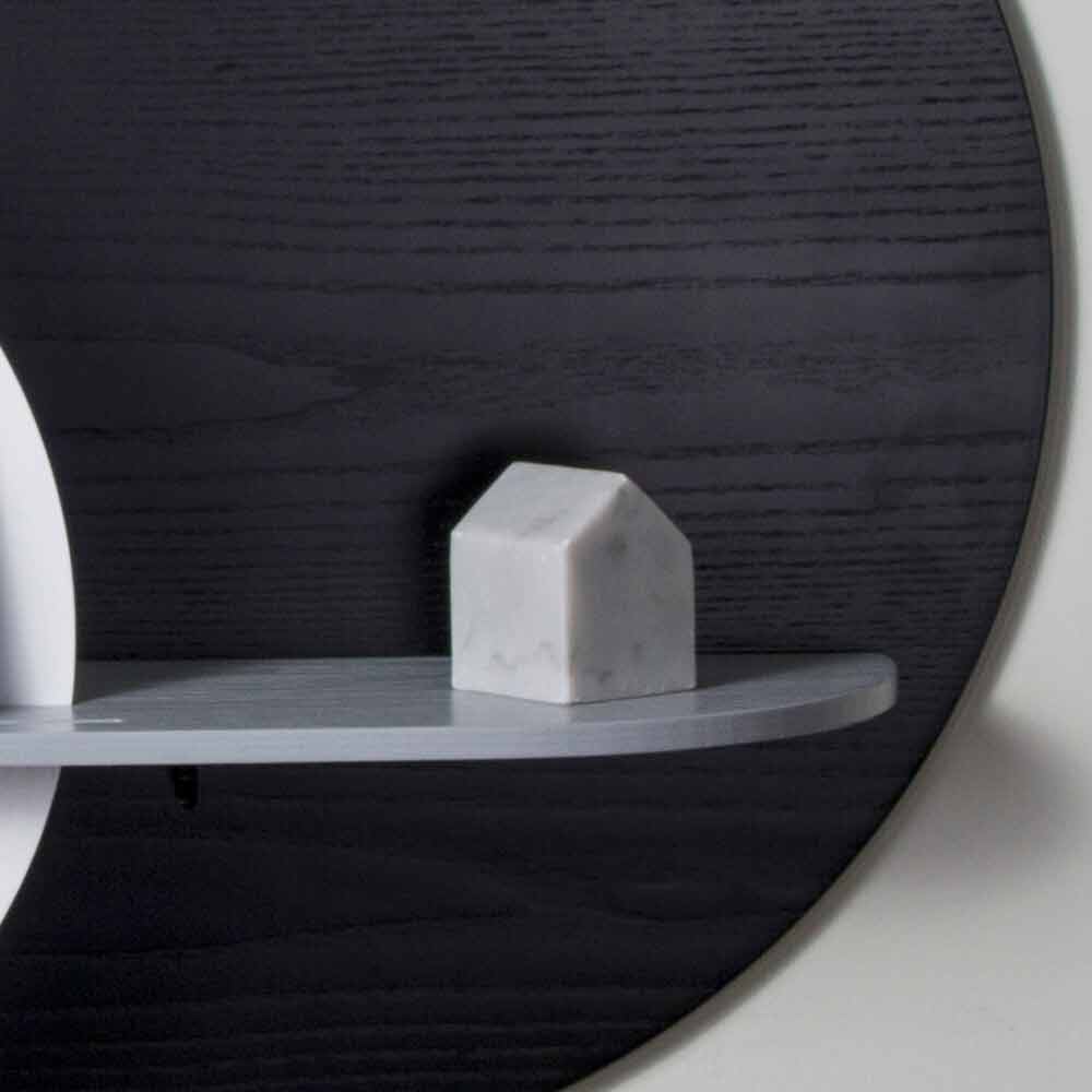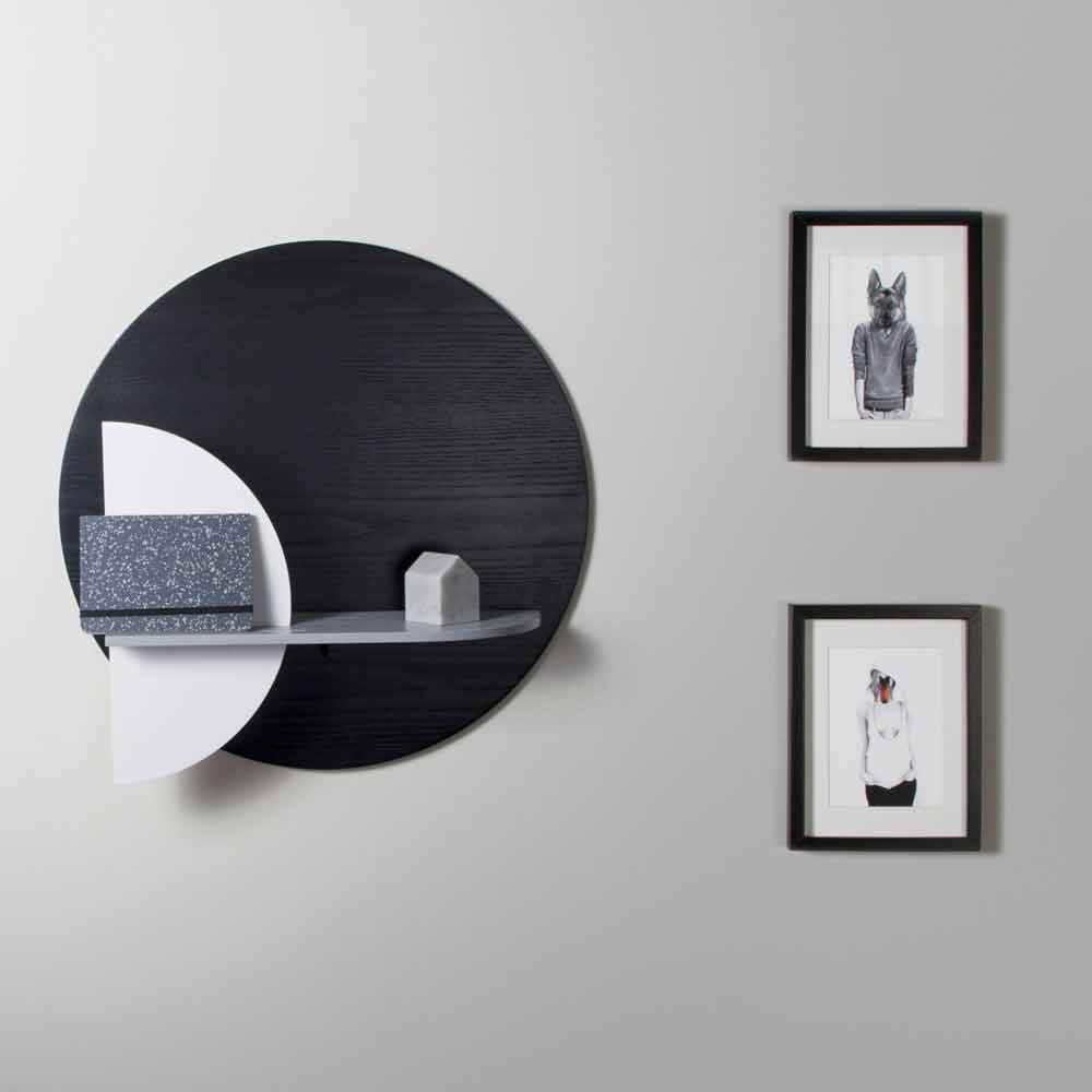 Su estructura está compuesta por 3 paneles de diferentes formas fabricados en contrachapado de fresno teñido de blanco, negro y gris, uno de los cuales está montado en la pared que representa la verdadera superficie de apoyo y dos paneles verticales que le dan movimiento y armonía. La peculiaridad de esta estantería es la posibilidad de personalizar el producto combinando los 2 paneles verticales que permiten elegir entre 8 configuraciones diferentes según gustos y necesidades.