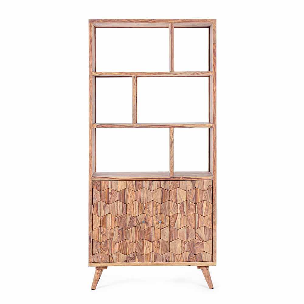 Librería de suelo con estructura de madera y pomos de acero estilo vintage.